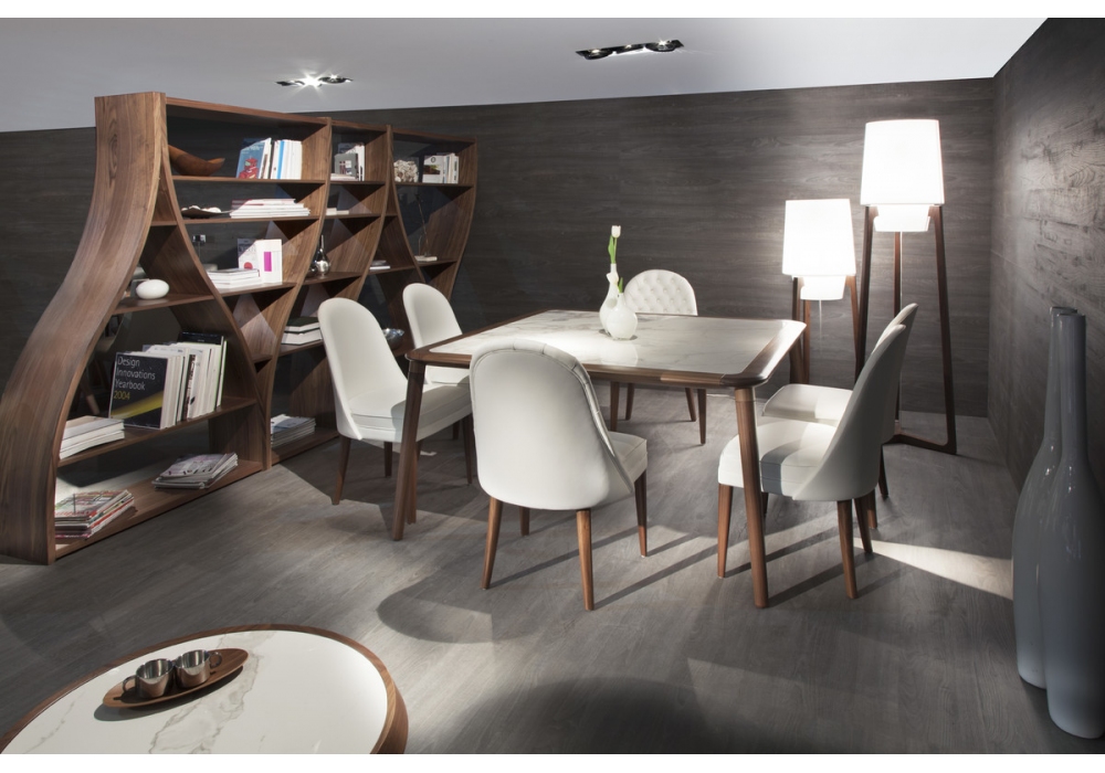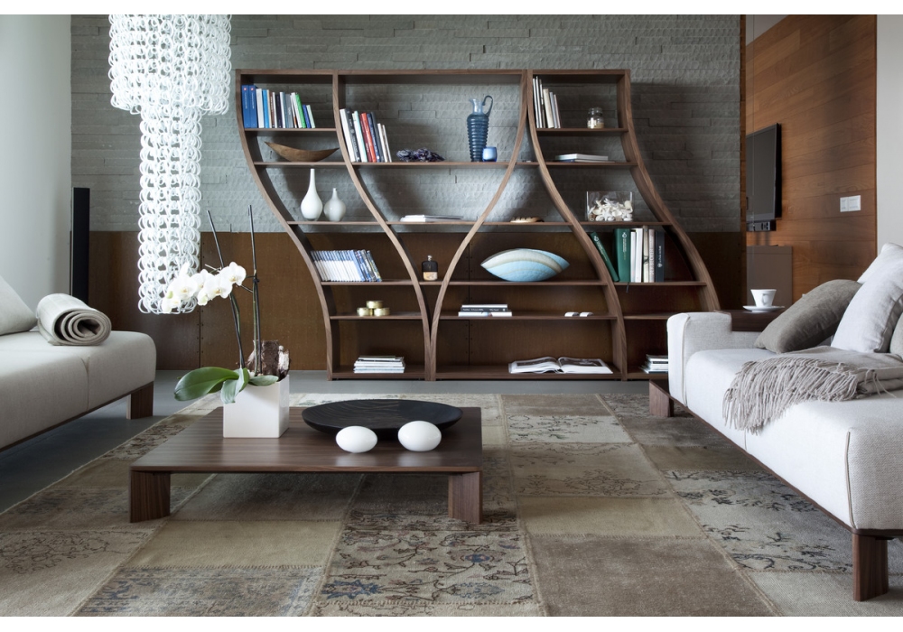 Silhouette 642 von Stefan Heiliger für Tonon entworfenest ein Regal mit einer Struktur aus MDF-Furnier aus Canaletto-Walnuss (30 mm) und Regalen aus Birke aus Furnier-Walnuss (18 mm). Erhältlich in zwei Versionen mit asymmetrischer Struktur, die von der Bewegung der Bäume inspiriert ist.