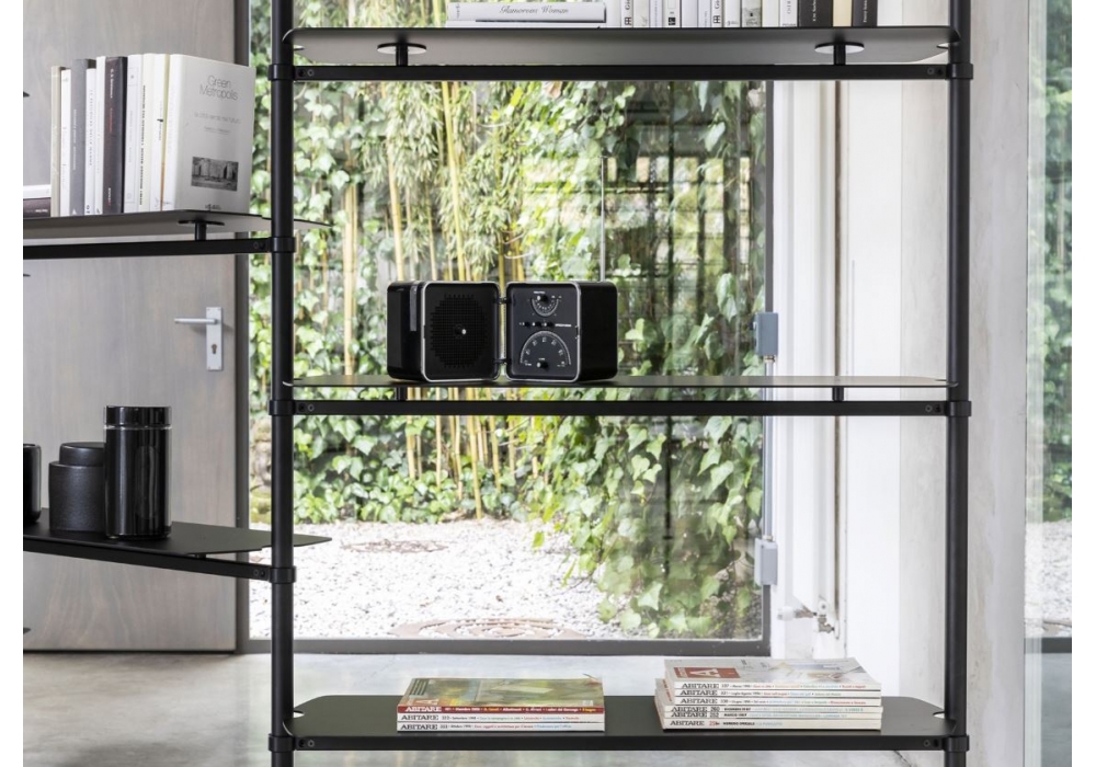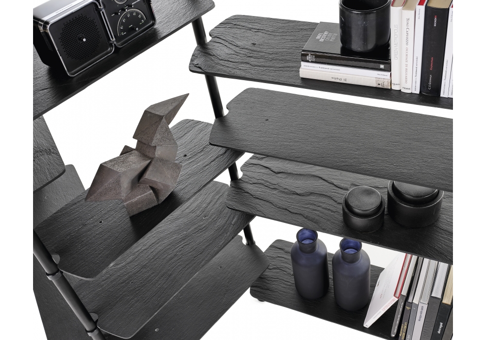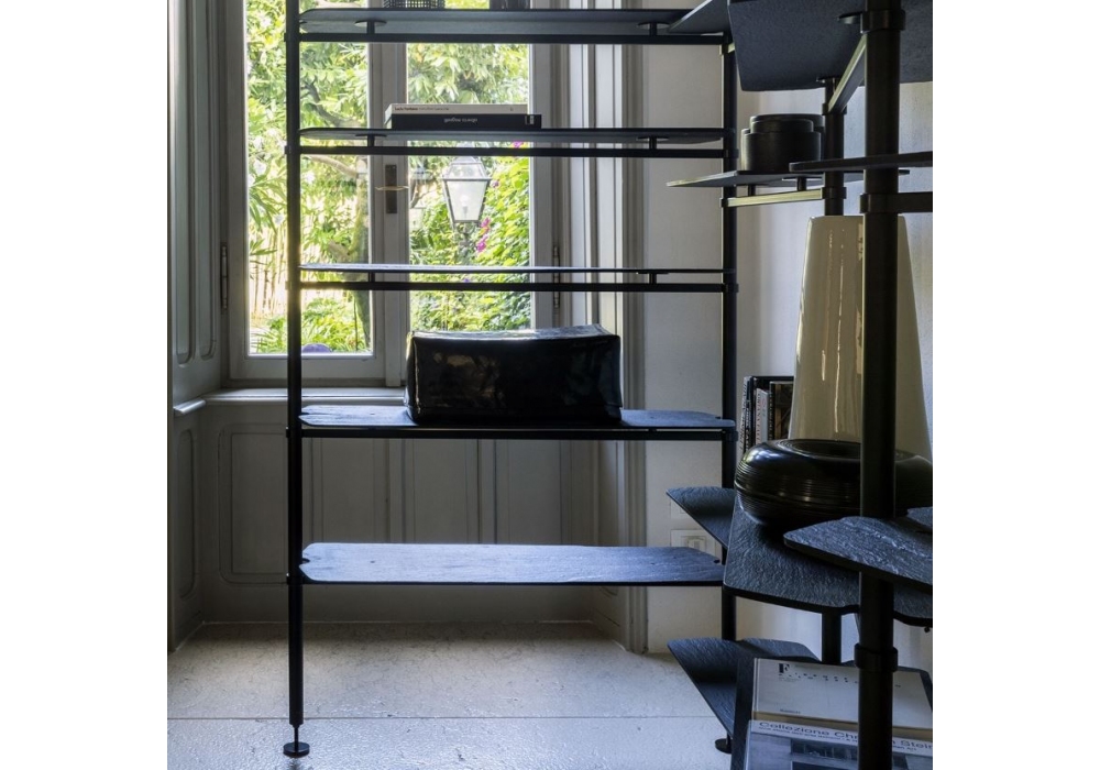 Levante von Sebastiano Tosi für Mogg entworfen, ist ein modulares Bücherregal aus mattschwarz lackiertem Metall, mit Decken- oder Wandbefestigung. Die Regalböden sind in folgenden Ausführungen erhältlich: Schiefer, Lärche wärmebehandelt, Metall mattschwarz lackiert. Verfügbar in mehreren Konfigurationen.