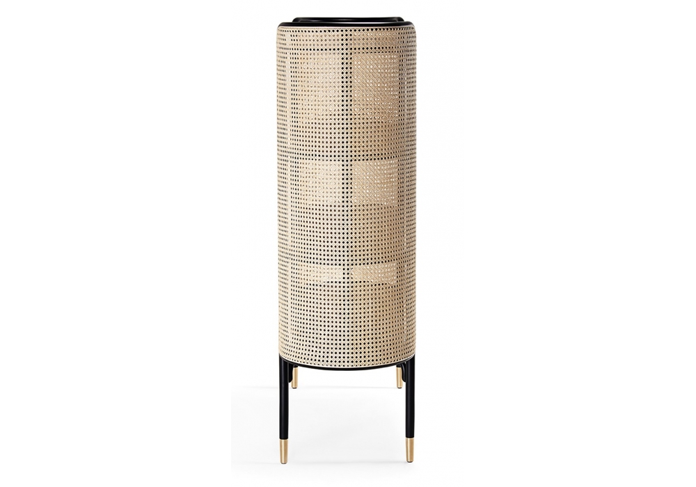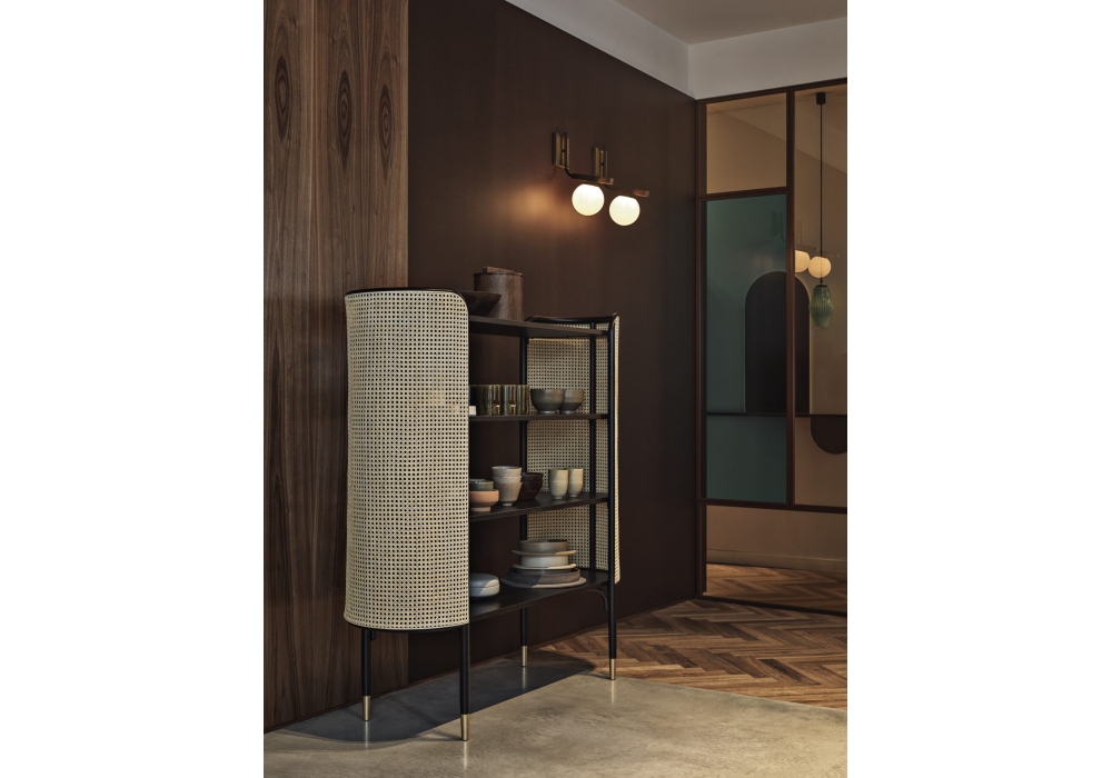 Mos von GamFratesi für Gebrüder Thonet Vienna entworfen, ist ein Bücherregal mit Buchenbugholzgestell und eingesetztem Wiener Geflecht. Regale aus offenporigem, lackiertem Eschefurnier. Messing-Füßen.