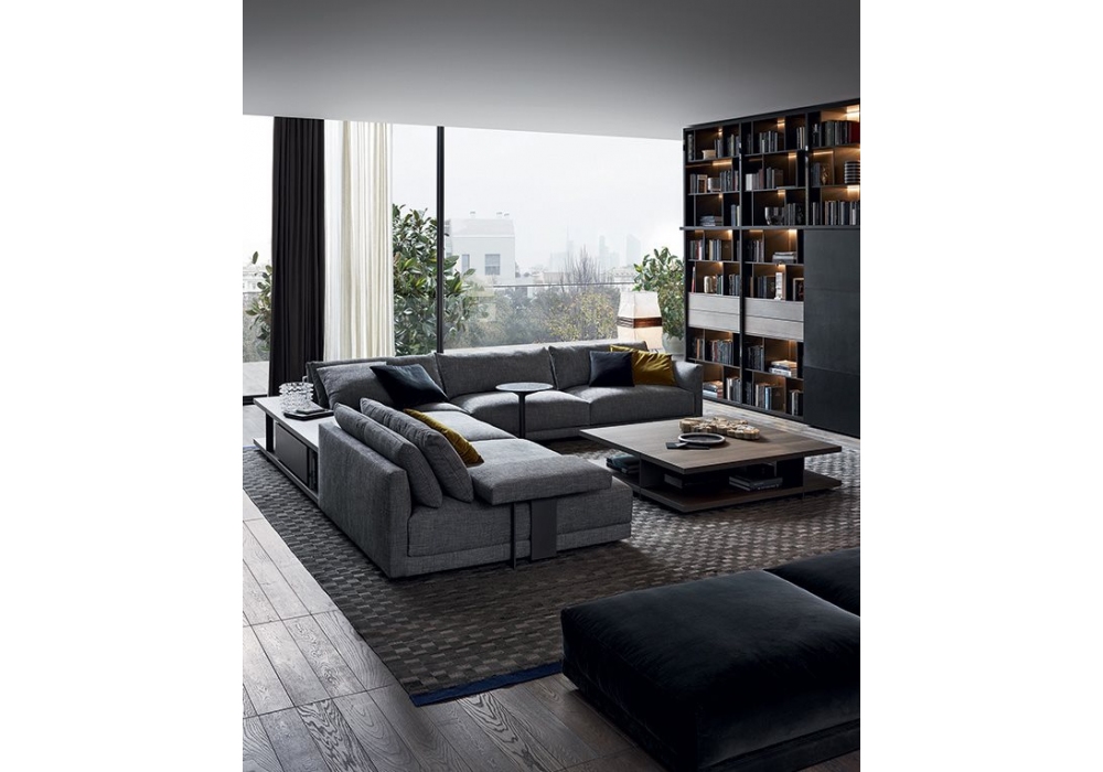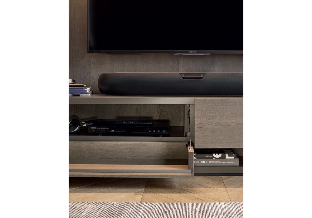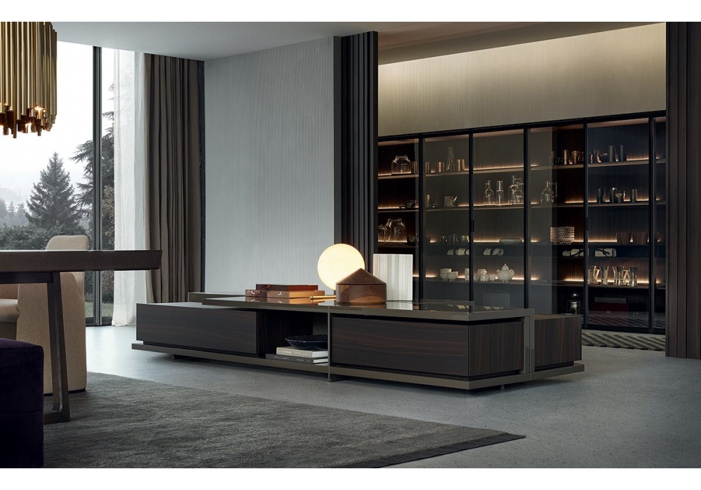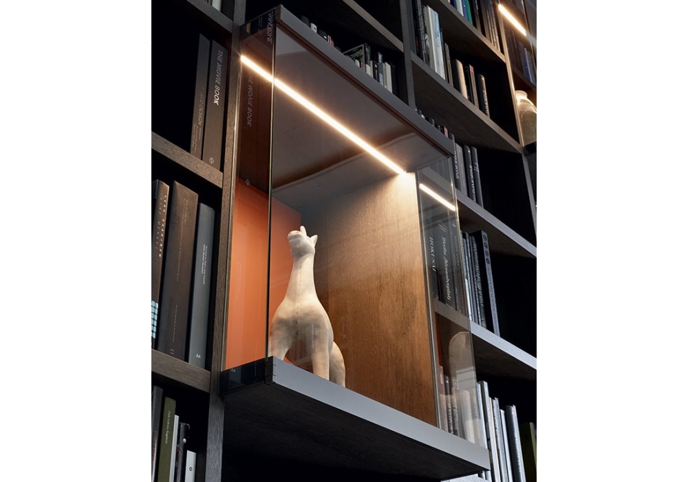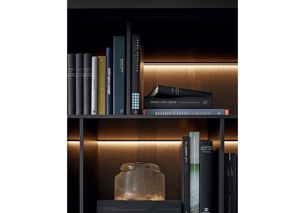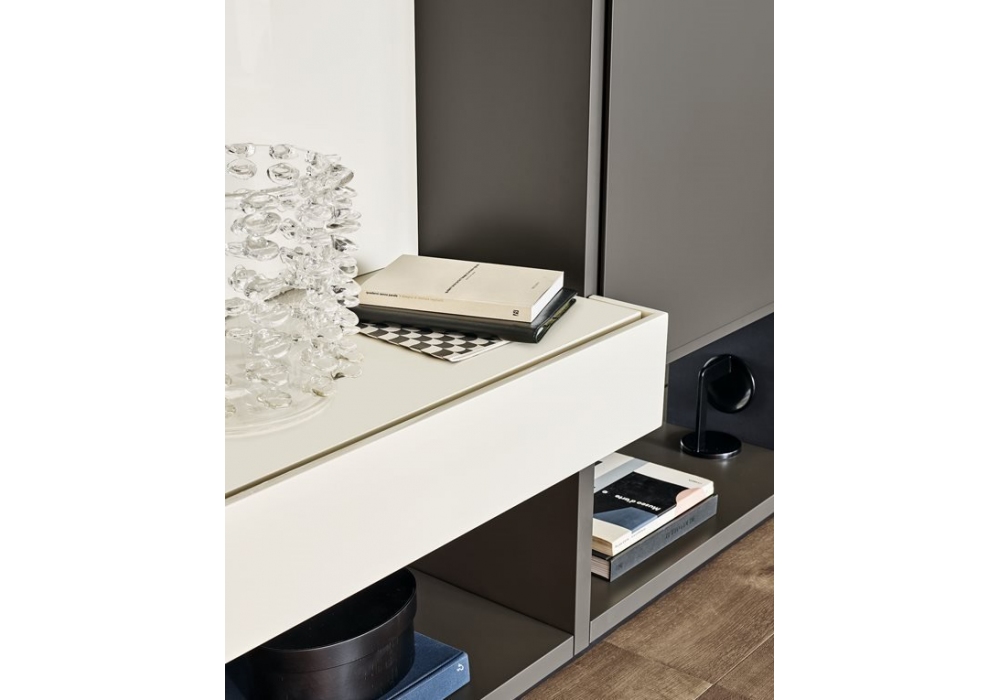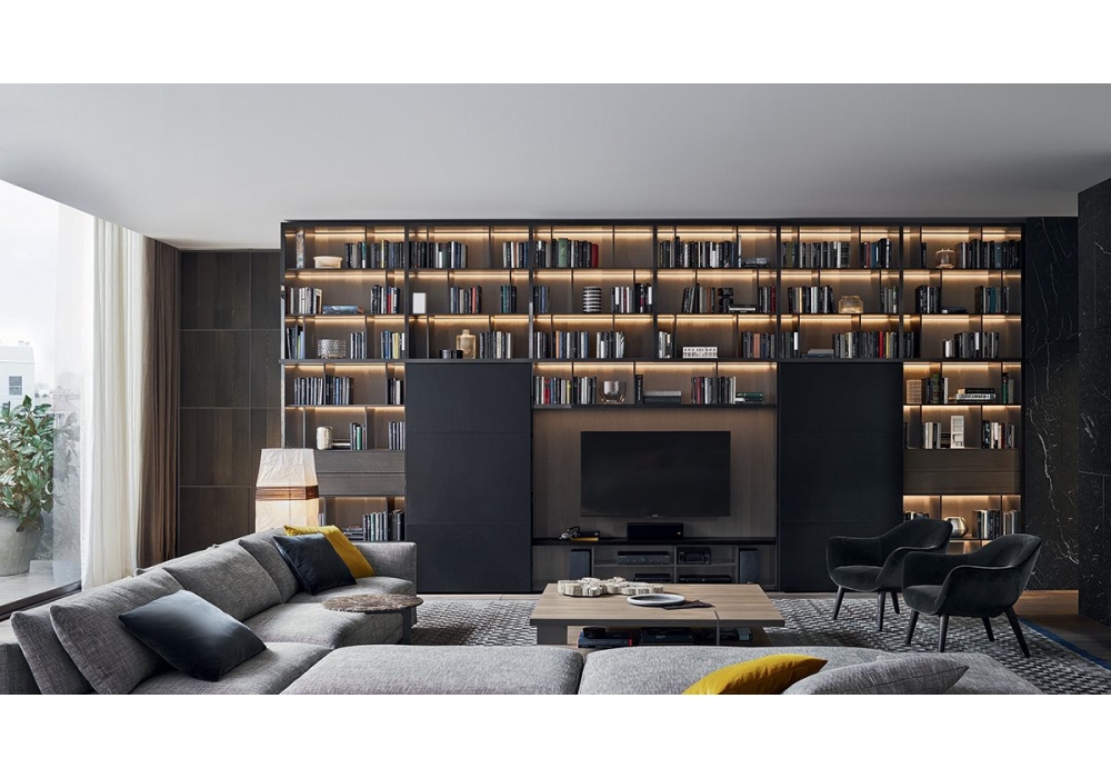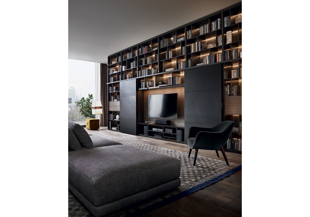 Wall System von R&D Poliform entworfen, ist ein vielseitiges kombinierbares System, mit dem man Einrichtungen für unterschiedlichste Räume im Haus gestalten kann, vom Wohnbereich über das Home-Office bis zum Schlafbereich. Die Strukturelemente sind in mattem, glänzendem Lack und Holz erhältlich.