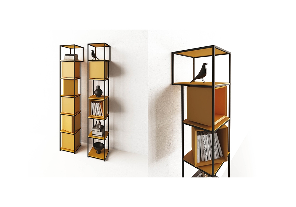 Formosa von DSH für Minotti Italia entworfen, ist ein Hochschrank mit an der Wand zu befestigender Eisenrohrstruktur, anthrazit geprägte Oberfläche, Regale in verschiedenen Farben erhältlich. Möglichkeit, drehbare Behälter hinzuzufügen. Zwei Größen erhältlich.