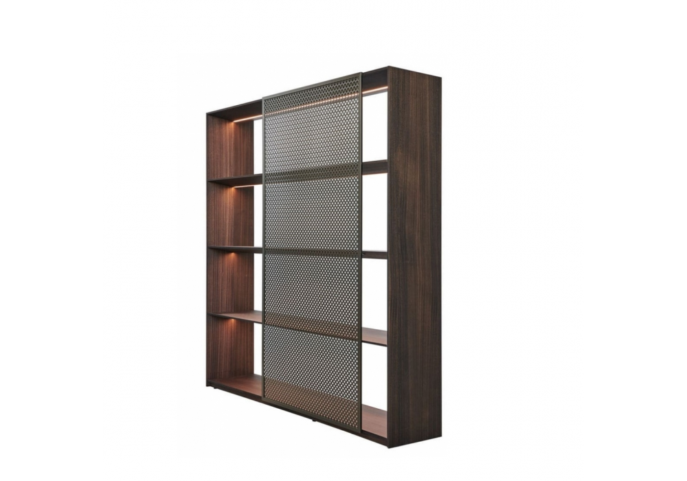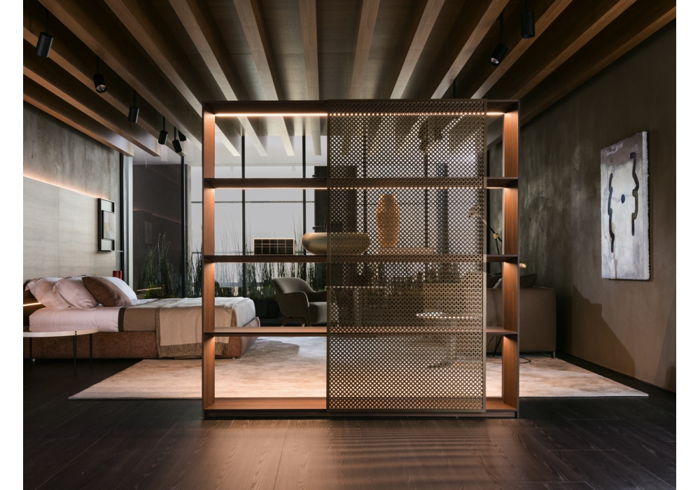 Ava von Foster + Partners für Molteni&C entworfen, ist ein Bücherregal mit Struktur und Regalen aus Eukalyptusholz und Metallrückenlehne aus bronzefarben lackiertem Aluminium.
