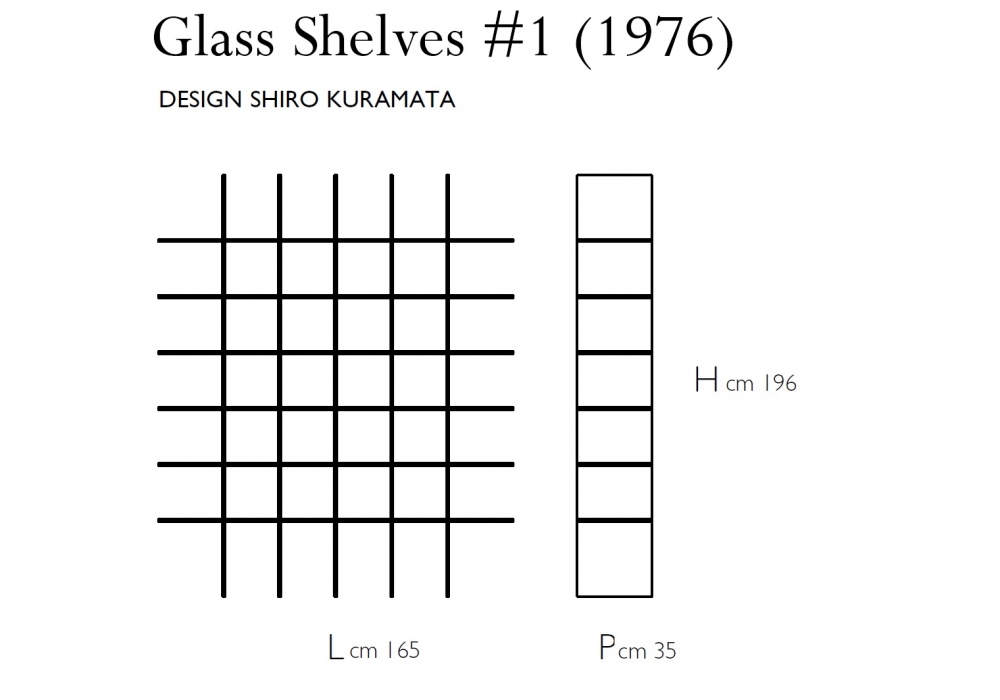 Glas Shelves #1 (1976), entworfen von Shiro Kuramata für Glas Italia, ist ein Bücherregal, das vollständig aus 12 mm transparentem Glas besteht. heißversiegelt, ohne die Hilfe eines fremden Elements.