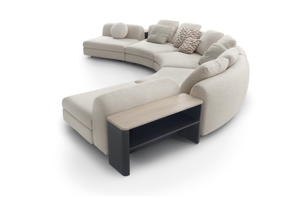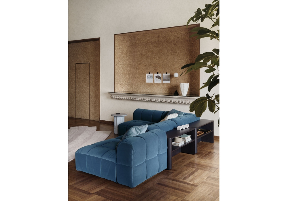 Tokio von Claesson Koivisto Rune für Arflex entworfen, ist ein Modul mit Regal, bestehend aus einer Struktur aus schokoladengefärbter Esche und einer Platte aus Travertino-Marmor oder schokoladengefärbter Esche.
