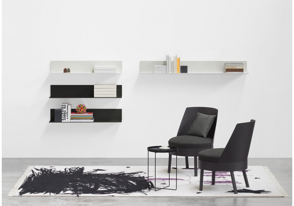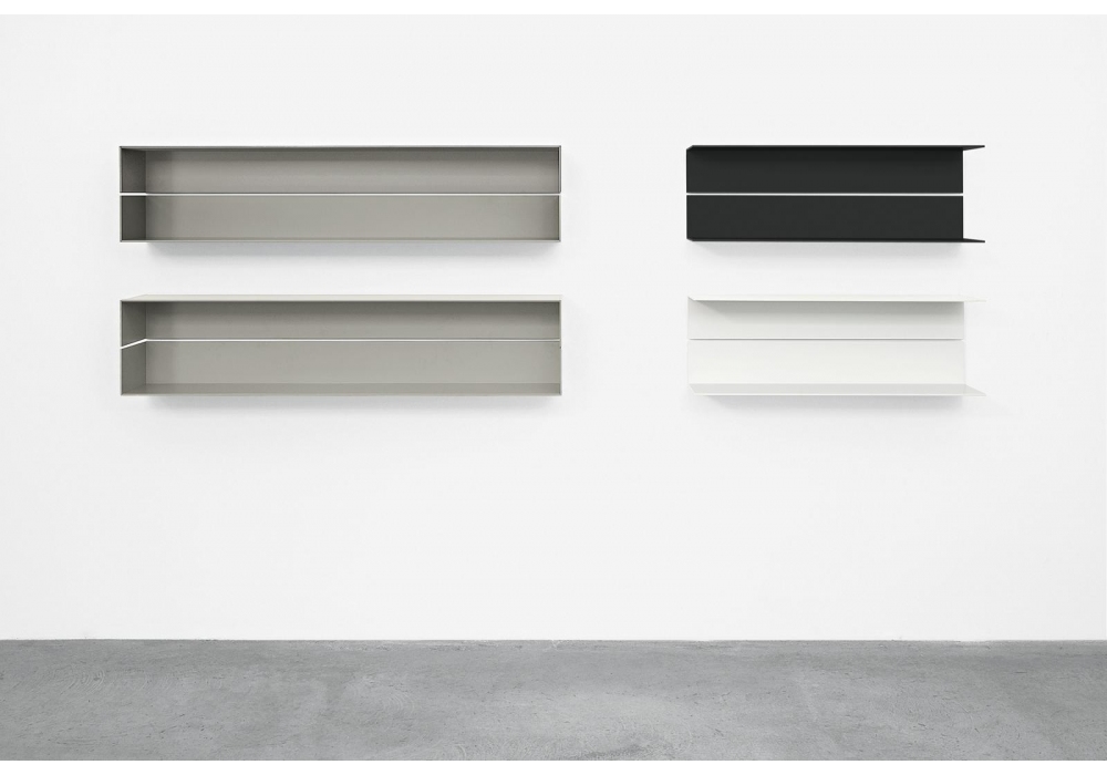 Profil, entworfen von Jörg Schellmann für E15, ist ein Bücherregal, das in einem Stück durch Extrusion hergestellt wird, es ist auch in der Version mit Seitenwänden in verschiedenen Größen und Ausführungen erhältlich.