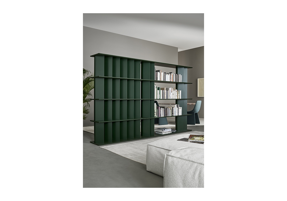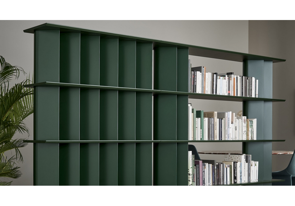Dogma, von Alain Gilles für Bonaldo entworfen, ist ein Bücherregal, das in 3 Größen erhältlich ist. Die Regale sind aus furniertem Holz und die Pfosten aus Metall in verschiedenen Farben.