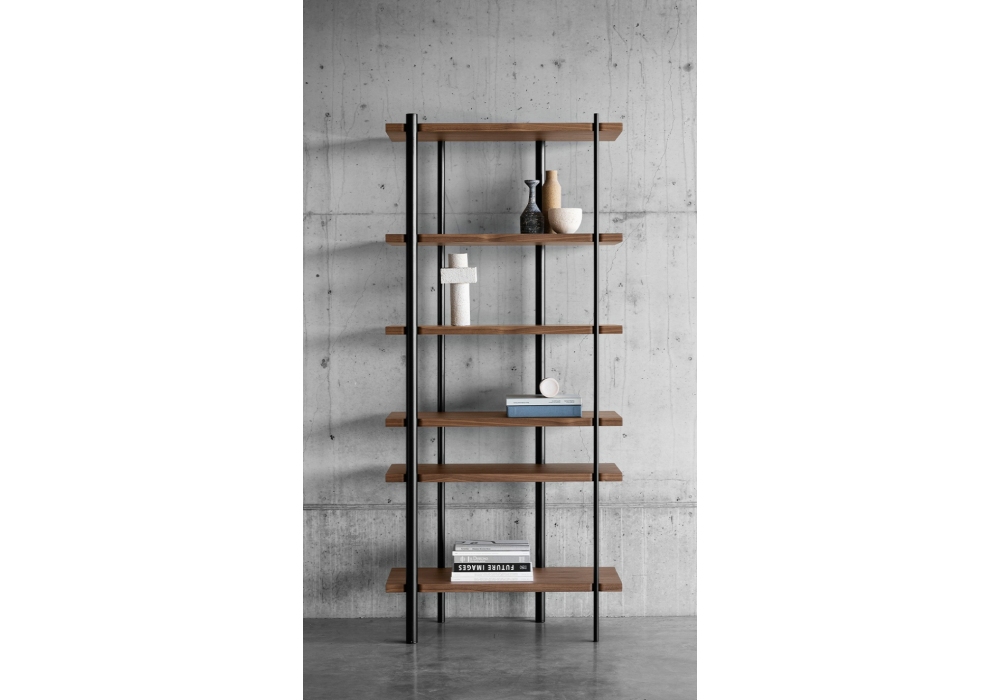 Milonga von Paolo Cappello für Miniforms entworfen, ist ein Bücherregal mit Struktur aus lackiertem Stab, in verschiedenen Farben, Regale erhältlich in der gleichen Ausführung wie die Struktur lackiert oder in geflammter Eiche, Canaletto-Nussbaum oder schwarzer Esche.