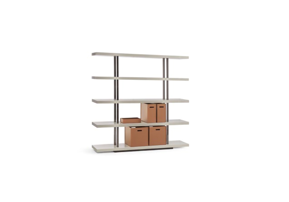 Hotello von C. Bimbi für Dema entworfen, ist ein Bücherregal mit Struktur aus satiniertem Stahl oder Metall mit galvanischer Oberfläche und Regalen aus glänzend lackiertem Wabenholz. Verfügbar in mehreren Ausführungen und Abmessungen. Lederbehälter auf Anfrage.