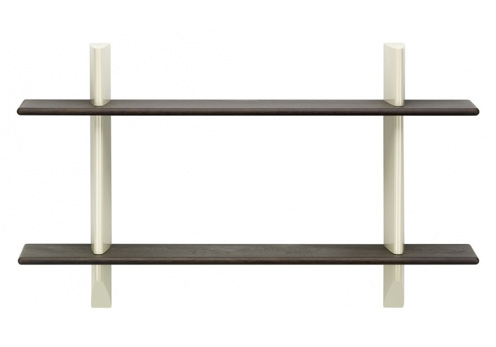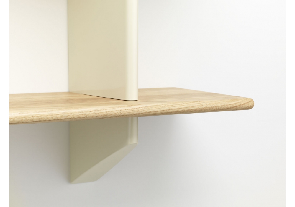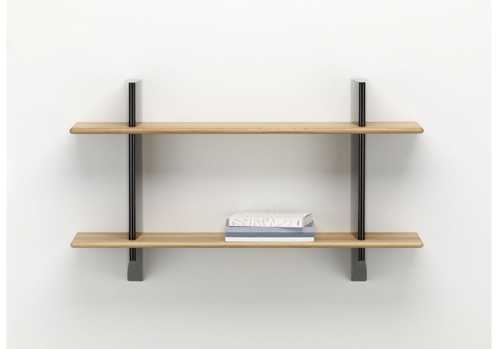 Rayonnage Mural von Jean Prouvé für Vitra entworfen, ist ein Wand-Bücherregal aus gebogenen Stahlblechhalterungen, pulverbeschichtet. Regale aus massiver Eiche natur mit Öl-Finish oder dunkel gebeizter massiver Eiche mit klarer Schutzlackierung.
