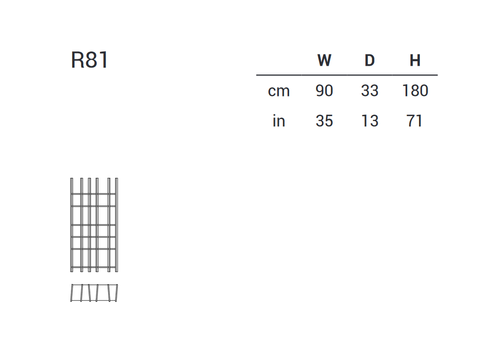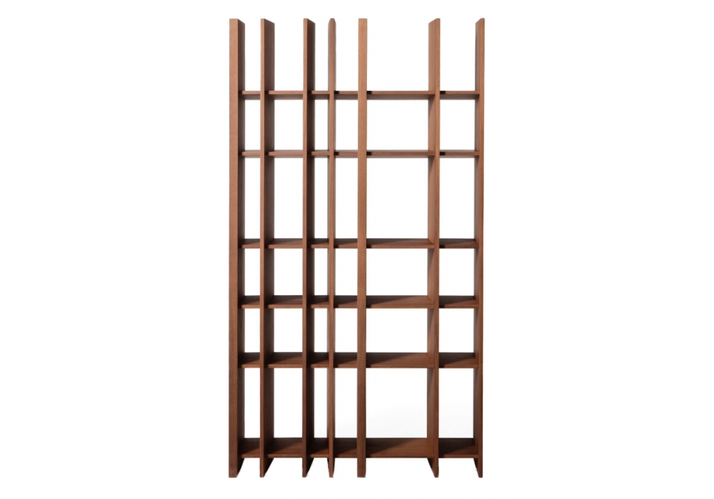 Sipario L, von Carlo Colombo für Emmemobili entworfen, ist ein Bücherregal-Trennelement/Bücherregal, das aus vertikalen Pfosten mit unterschiedlichen Winkeln aus furniertem Sperrholz besteht, mit Elementen, die leicht kombiniert werden können, um Kompositionen von unbegrenzter Länge zu schaffen. Die Kompositionen sind freistehend.