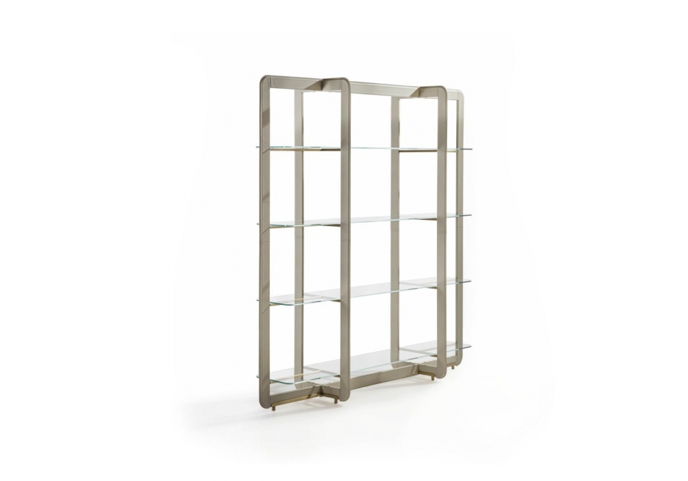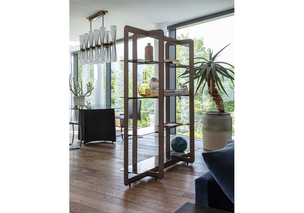 Musa von RedCreative für Enrico Pellizzoni entworfen, ist ein Bücherregal mit röhrenförmiger Metallstruktur, die mit Leder bezogen ist, Kristallregale und Details aus Messing oder lackiertem Metall.