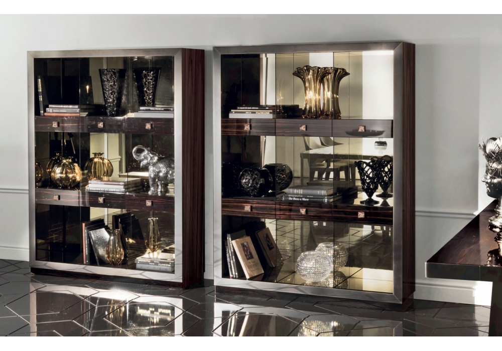 Emily von Guseppe Viganò für Longhi entworfen, ist ein Bücherregal mit sechs Schubladen, die Struktur ist aus furniertem oder glänzend lackiertem Holz und die Vorderkante ist aus geschliffenem Metall. Griffe aus Marmor. Innen mit bronzefarbenem oder geräuchertem abgeschrägtem Spiegel ausgekleidet. Verfügbar in der Version mit oder ohne Rückenlehne.