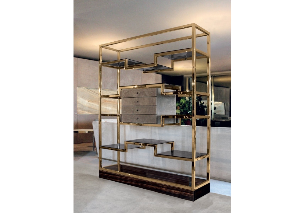 Etruria von AL1 für Longhi entworfen, ist ein Bücherregal mit Metallstruktur, Regalen aus Bronze oder gehärtetem Rauchglas und unterem Regal aus furniertem Holz. Verfügbar in der Version mit Kommode oder Vitrine aus Holz oder Polsterung aus Leder.
