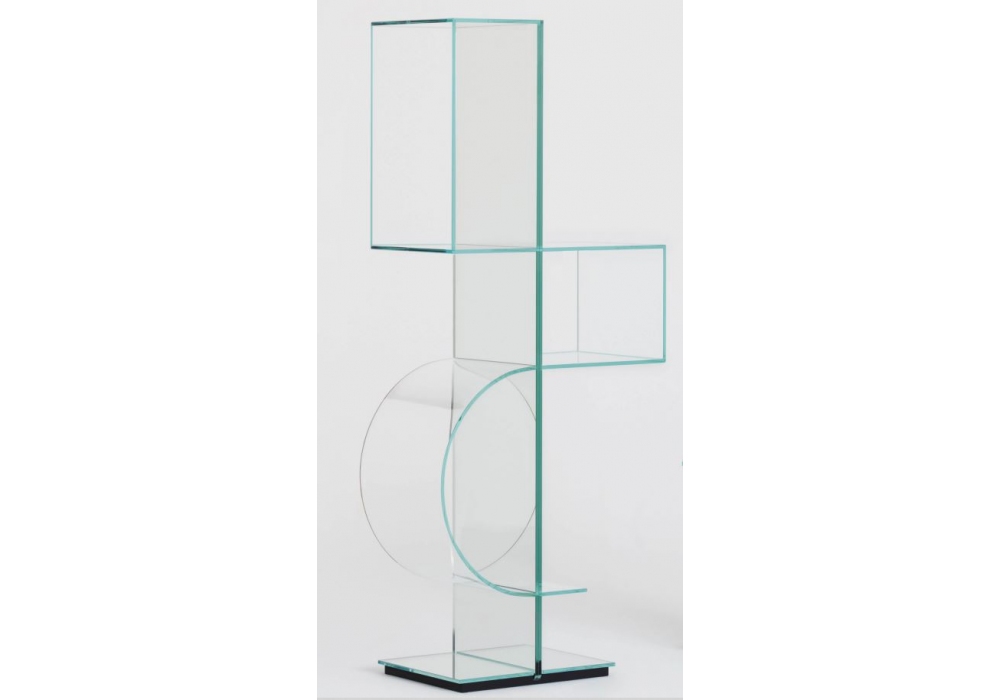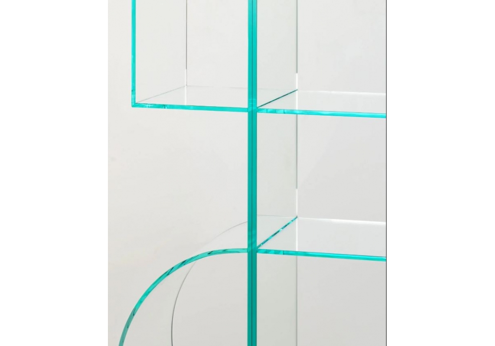 Ollie von Yabu Pushelberg für Glas Italia entworfen, ist ein Totem-Bücherregal mit vertikaler Rückwand aus doppelseitigem, laminiertem, extraklarem Spiegel. Die an die Rückwand geschweißten Regalböden bestehen aus 10 mm starkem, extraklarem Glas, das im 45°- und 180°-Winkel verklebt ist. Die verspiegelte Rückwand erzeugt ein Spiel von Reflexen, das einen Effekt von Tiefe und Kontinuität erzeugt. Der abnehmbare Sockel ist mit extraklarem Spiegel verkleidet.