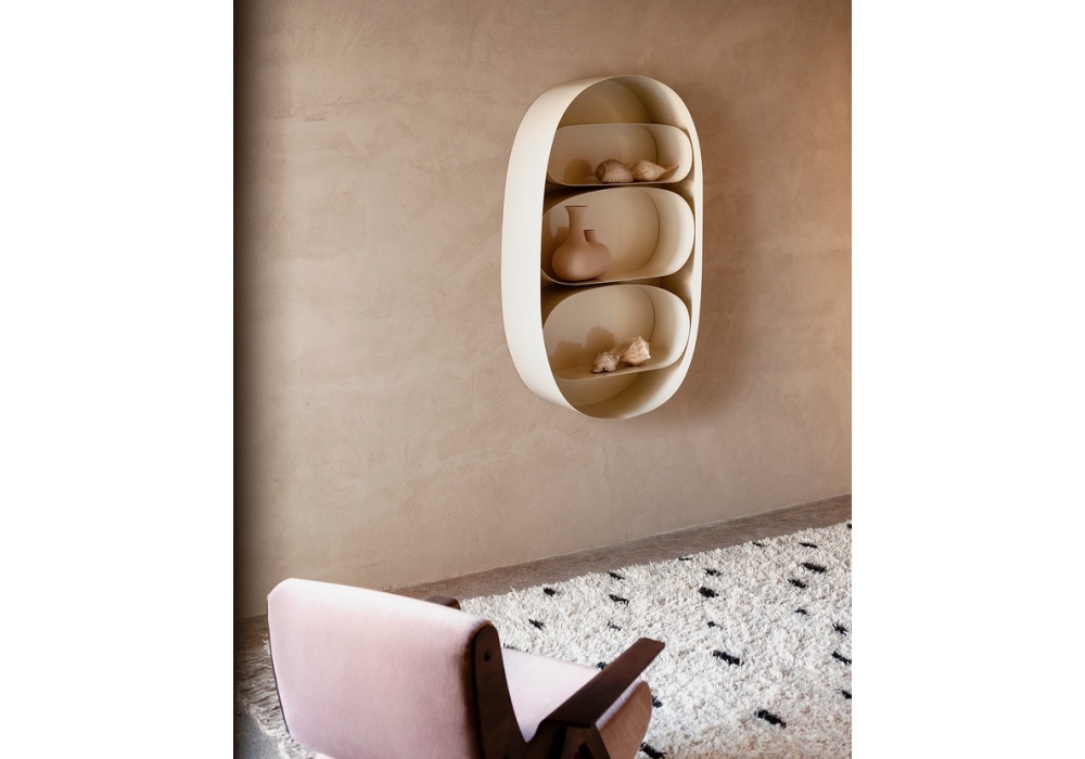 Astral von Faye Toogood für Tacchini entworfen, ist ein Bücherregal aus pulverbeschichtetem Metallblech mit einer matten Innenoberfläche und einer glänzenden Außenoberfläche. Verfügbar in verschiedenen Ausführungen.