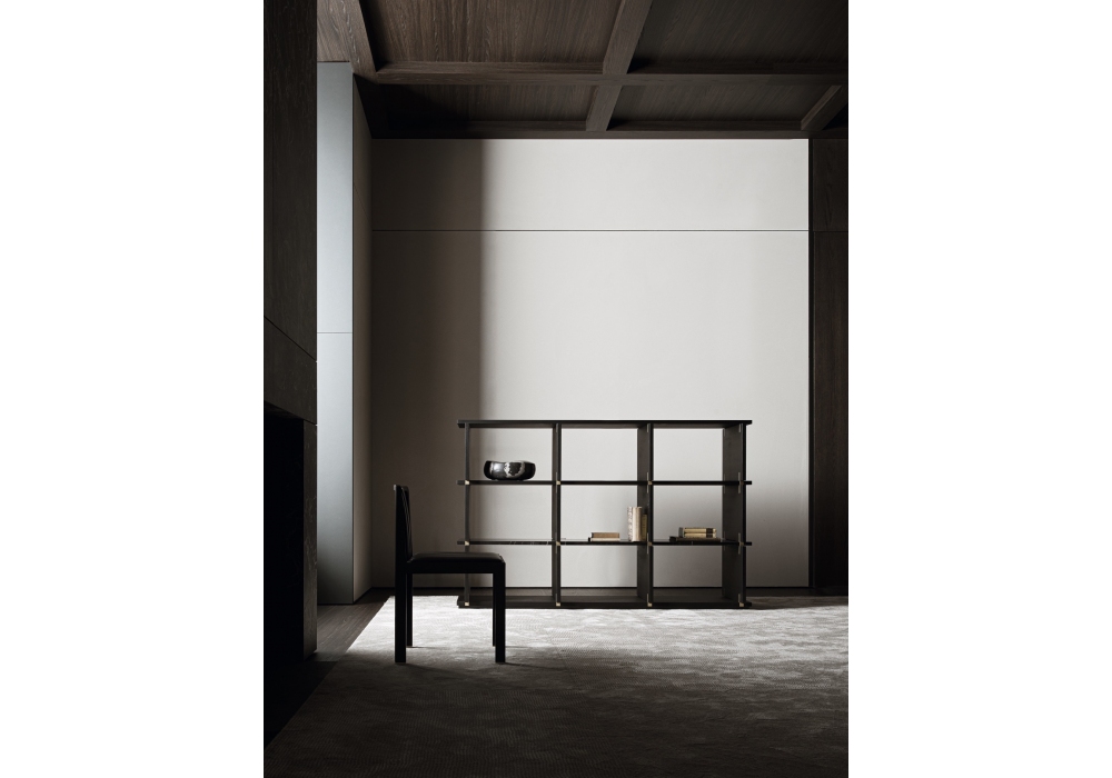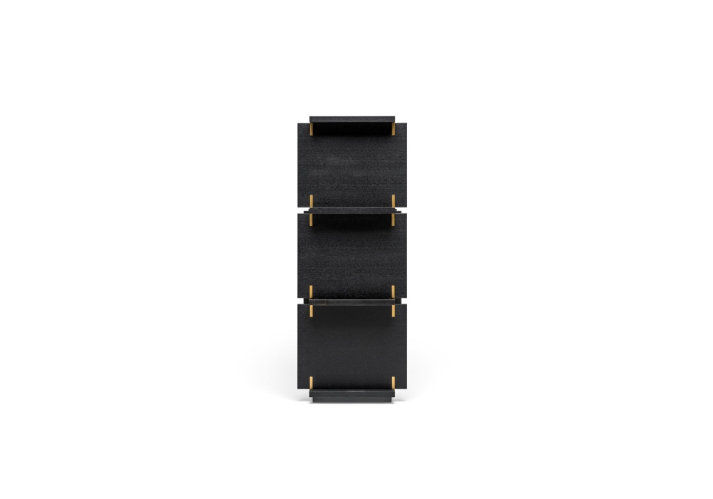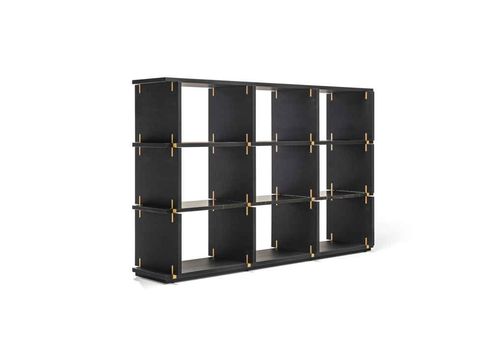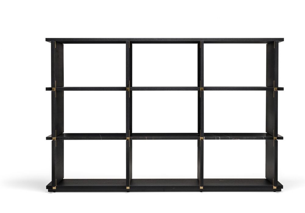 Card von Michael Anastassiades für Molteni&C entworfen, ist ein Bücherregal mit Seiten, Sockel und Oberseiten aus schwarzem Eichenholz, einer kastenförmigen Marmorplatte mit Sahara-Noir-Marmor-Keramikeinsatz, lackierten Messingeinsätzen und einem metallischen Bodensockel mit Epoxidfarbe. Verfügbar in mehreren Modellen. Es sind keine Kürzungen jeglicher Art oder Änderungen der Typen und Ausführungen möglich.
