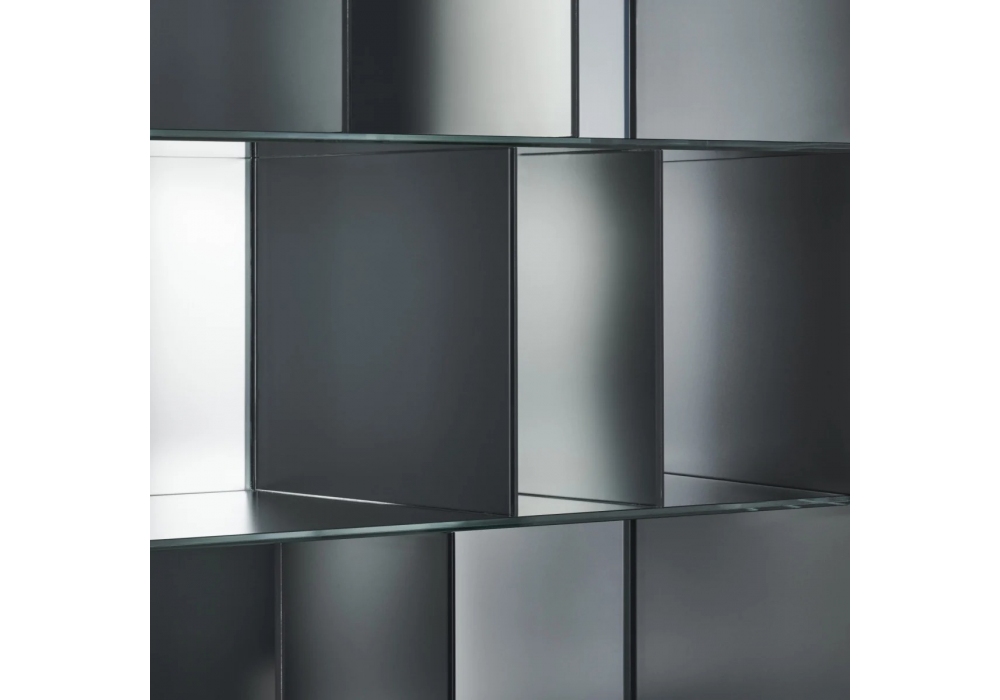 Obliquo von Piero Lissoni für Glas Italia entworfen, ist ein Behälter, das vollständig aus verschiedenen Elementen aus geschichtetem und mattiertem Glas besteht. Der äußere Teil hat eine verspiegelte Chromoberfläche, während der innere Teil undurchsichtig verspiegelt ist.