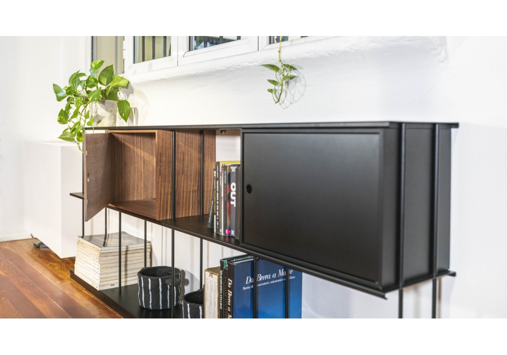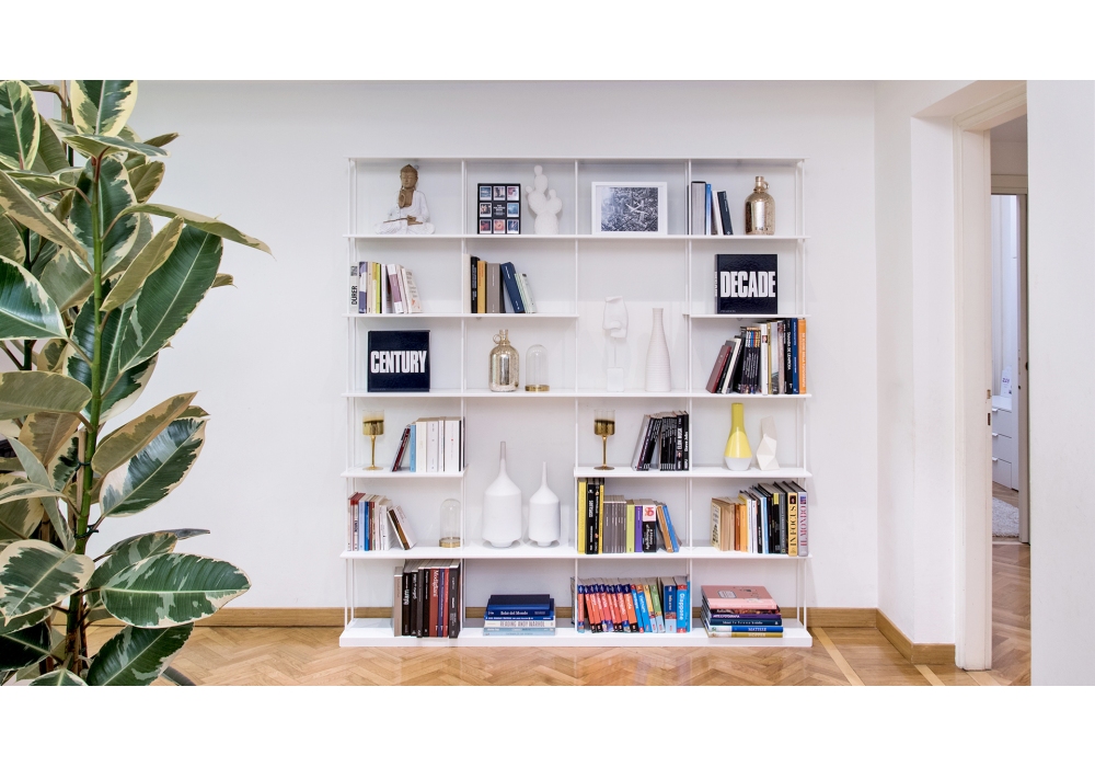 Krossing Maxi von Kriptonite entworfen, ist ein Wandsystem, das das Gewicht auf den Boden verlagert. Es kann als Weiterentwicklung des Krossing-Systems betrachtet werden, da es dank seiner größeren Tiefe (25 cm) große Bücher und Zeitschriften aufnehmen kann. Erhältlich in eloxiertem Aluminium oder Weiß. Neben den Standardmaßen und -ausführungen können Sondergrößen und -farben angefragt werden.