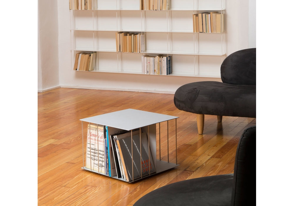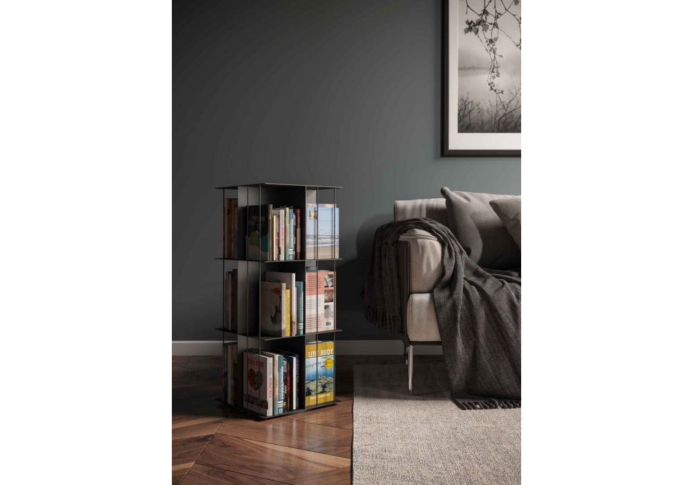 Krossing Rotante von Kriptonite entworfen, ist ein Selbsttragendes und drehbares System, das nach dem gleichen Prinzip wie das wandmontierte Krossing hergestellt wird und aus einfachen Elementen wie Rohren, Regalen und Trennwänden besteht. Es werden zwei Plattengrößen geliefert: 33 x 33 cm (Bücher, CDs, DVDs) und 50 x 50 cm (Zeitschriften), die nicht miteinander kombiniert werden können. Sie können Ihre eigene Struktur mit Basis- und Zusatzmodulen zusammenstellen. Erhältlich in eloxiertem Aluminium oder Weiß. Zusätzlich zu den Standardmaßen und -ausführungen können Sondergrößen und -farben angefordert werden.