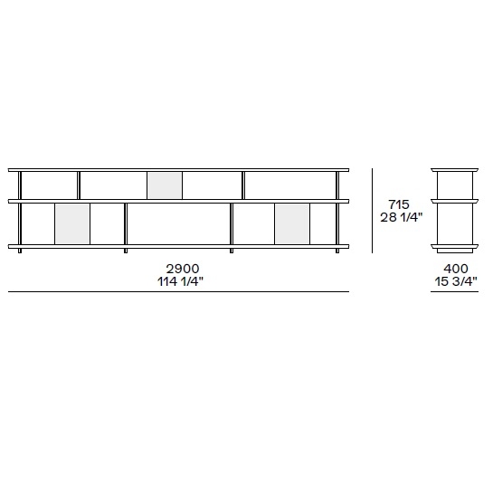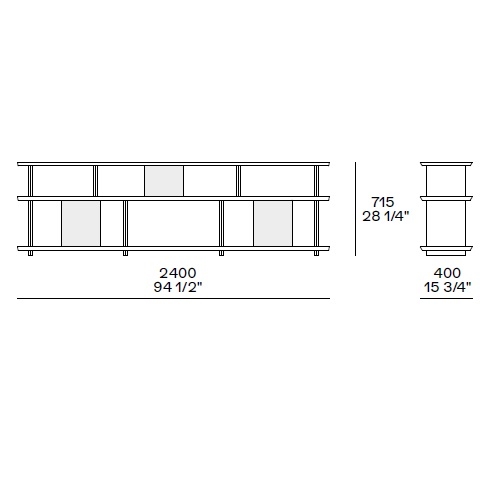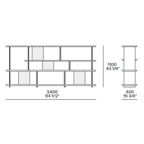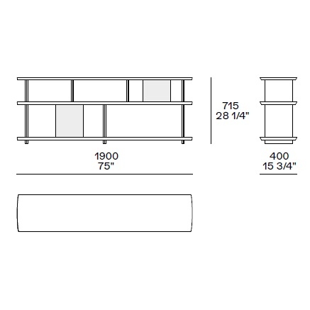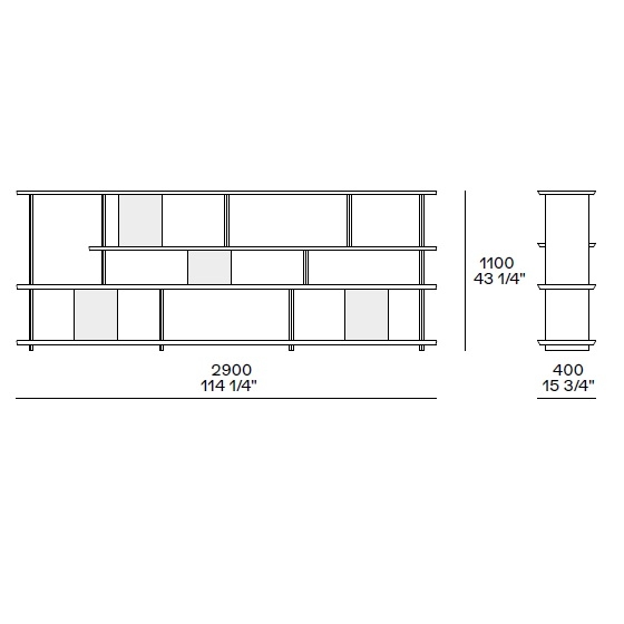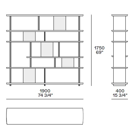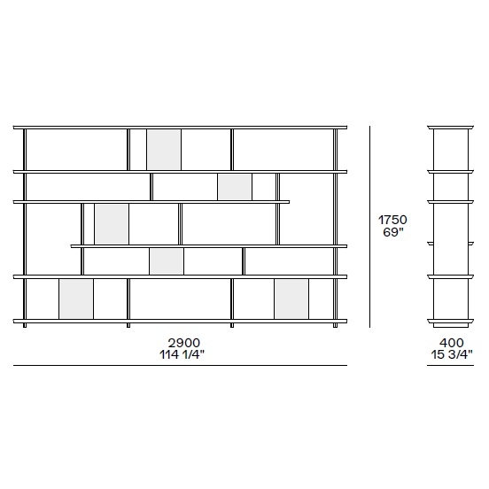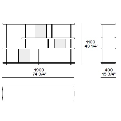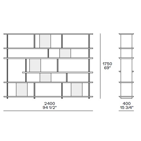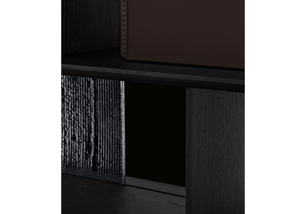 Tess von Jean-Marie Massaud für Poliform entworfen, ist ein Bücherregal mit einer Struktur aus mitteldichter Faserplatte, furniert mit schwarzem Ulmenholz, mit verschiebbaren Rückwänden aus gestreiftem Fumé- oder Bronzeglas. Optionale Boxen in Lederfarben.