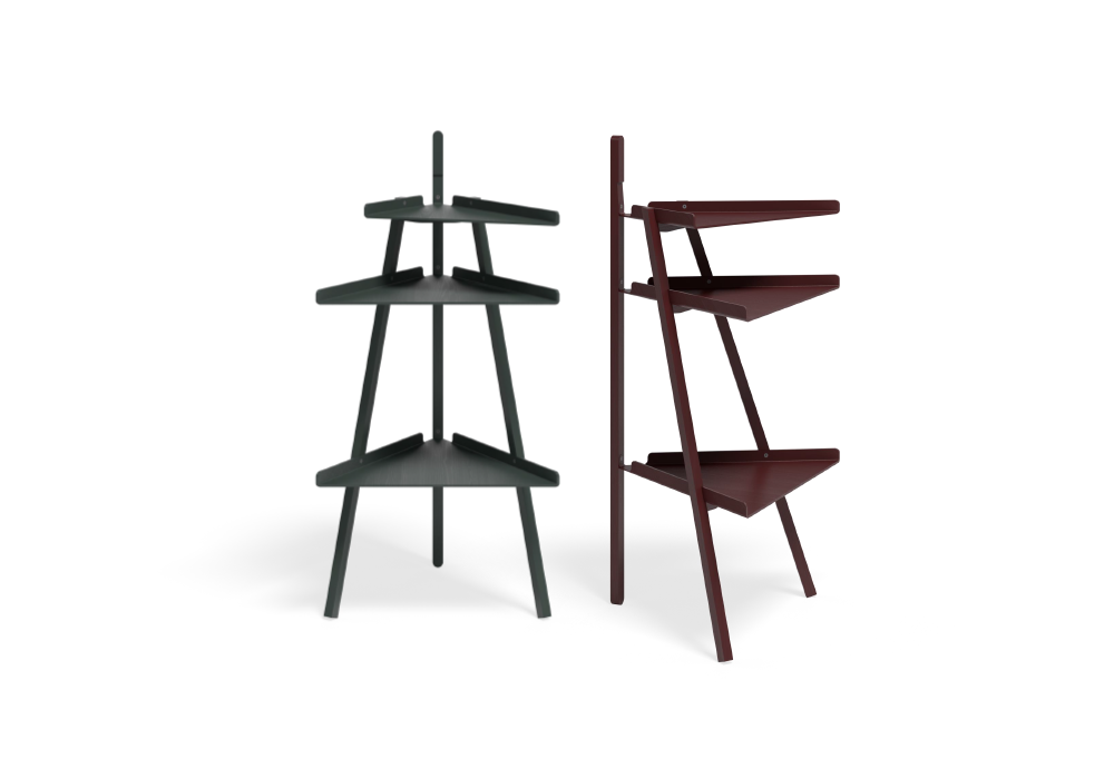 Trio von Achille & Pier Giacomo Castiglioni für Karakter entworfen, ist ein dreistöckiges Eckbücherregal aus Eiche. Verfügbar in mehreren Ausführungen.