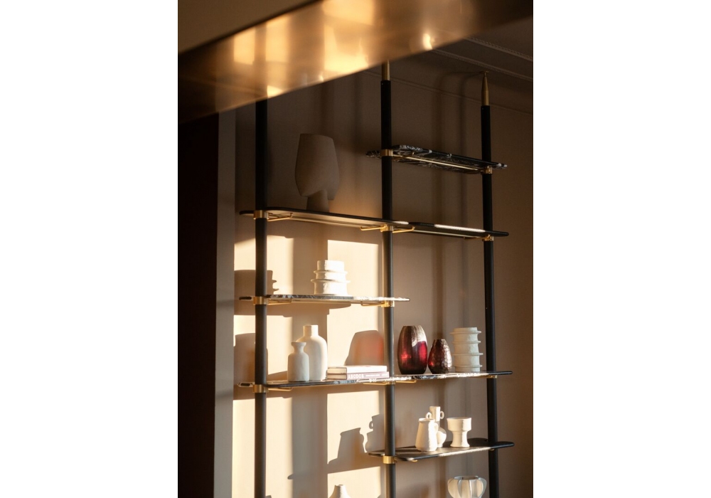 Lloyd von Baxter P. entworfen, ist ein modulares Bücherregal mit Tragstruktur aus Aluminiumrohr, furniert in gebürsteter Eiche in verschiedenen Farbtönen, Befestigung an Decke oder Wand mit Stiften. Regalböden aus Stein oder massiver gebürsteter Eiche in verschiedenen Farbtönen. Aufbewahrungsmöbel aus gebogenem MDF mit Lederbezug. Regalträger aus Messing in verschiedenen Ausführungen. Die Möglichkeit, das offene Bücherregal völlig kreativ zu gestalten, ermöglicht es Ihnen, die offenen Räume individuell zu gestalten und ein funktionales und wirkungsvolles Raster zu schaffen. Lloyd lädt zur Kreativität ein und ermöglicht Ihnen einzigartige Konfigurationen, in denen Funktionalität mit Ästhetik verschmilzt.