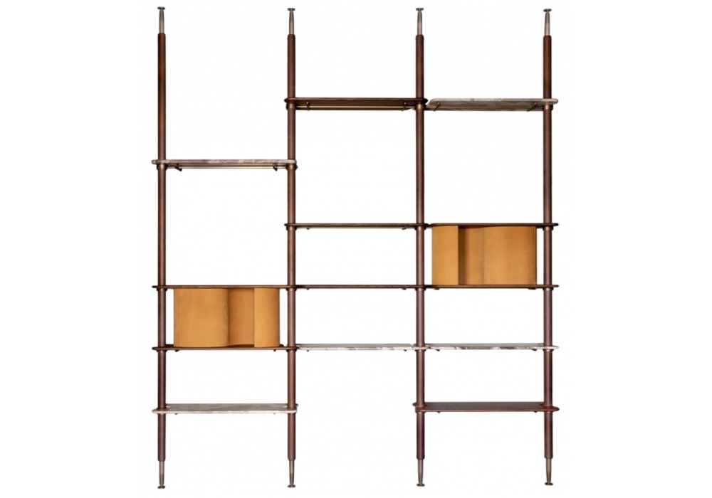 Lloyd von Baxter P. entworfen, ist ein modulares Bücherregal mit Tragstruktur aus Aluminiumrohr, furniert in gebürsteter Eiche in verschiedenen Farbtönen, Befestigung an Decke oder Wand mit Stiften. Regalböden aus Stein oder massiver gebürsteter Eiche in verschiedenen Farbtönen. Aufbewahrungsmöbel aus gebogenem MDF mit Lederbezug. Regalträger aus Messing in verschiedenen Ausführungen. Die Möglichkeit, das offene Bücherregal völlig kreativ zu gestalten, ermöglicht es Ihnen, die offenen Räume individuell zu gestalten und ein funktionales und wirkungsvolles Raster zu schaffen.