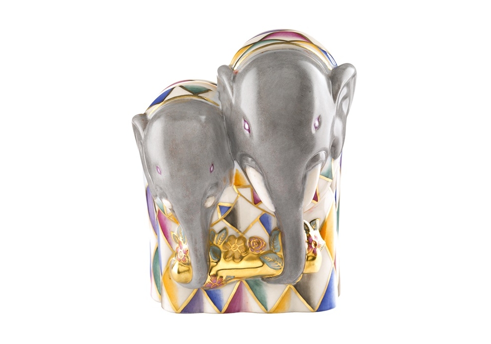 Elefanti Accoppiati Gio Ponti von Gio Ponti für Ginori 1735 entworfen, ist eine Skulptur aus Porzellan, handdekoriert in Polychromie mit schattiertem Schachbrettmuster und reinen Golddetails, veröffentlicht in einer limitierten und nummerierten Auflage.