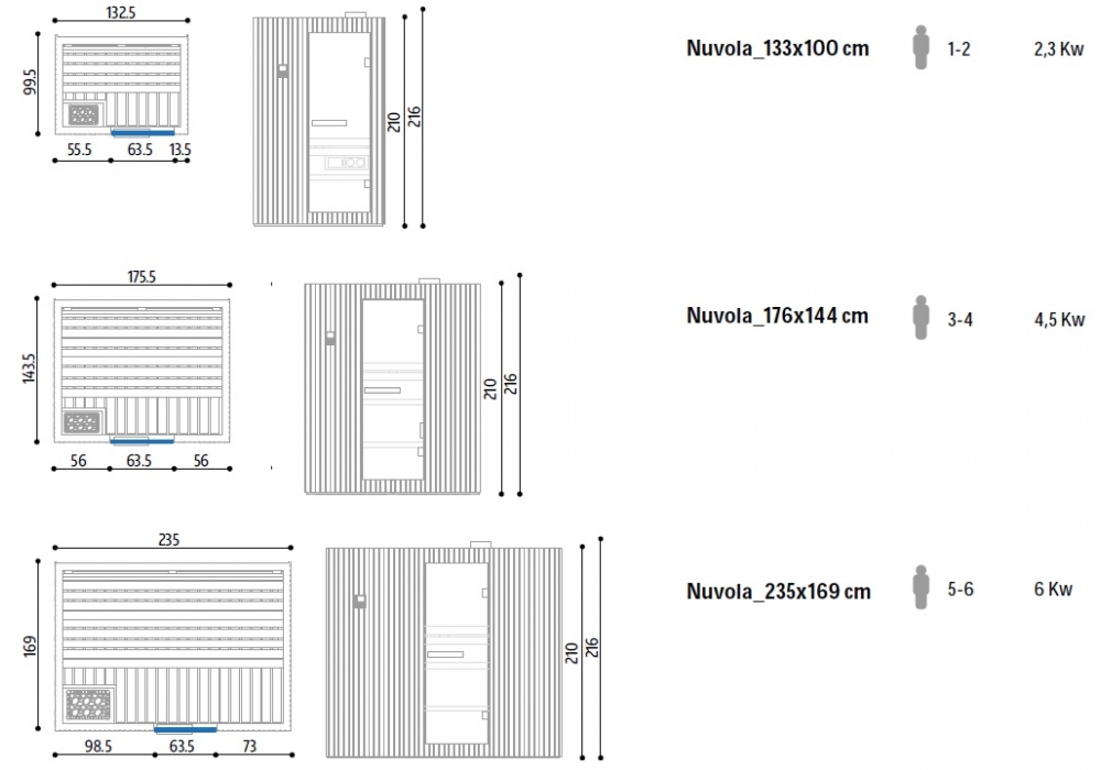 | Abmessungen | L 133 x W 100 x H 210 cm; L 176 x W 144 x H 210 cm; L 235 x W 169 x H 210 cm |