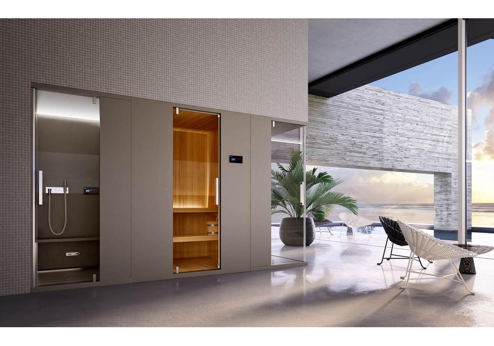 PasoDoble von Glass Lab entworfen, ist eine finnische Sauna. Ofen mit Steine und verspundeten Holzabdeckung, Festsitzbank, beweglicheSitzbank, Fußstütze, Tastatur mit Hinterleuchtung, interne Led-Beleuchtung, Sanduhr, Hygrometer, Thermometer. Einschaltprogrammierung, Kontrolle und Einstellung der Temperatur und der Zeit, elektronischen Uhr. Frontfenster aus Glas, LED-Farblichttherapie und Bluetooth Audio Kit wie Zubehör.