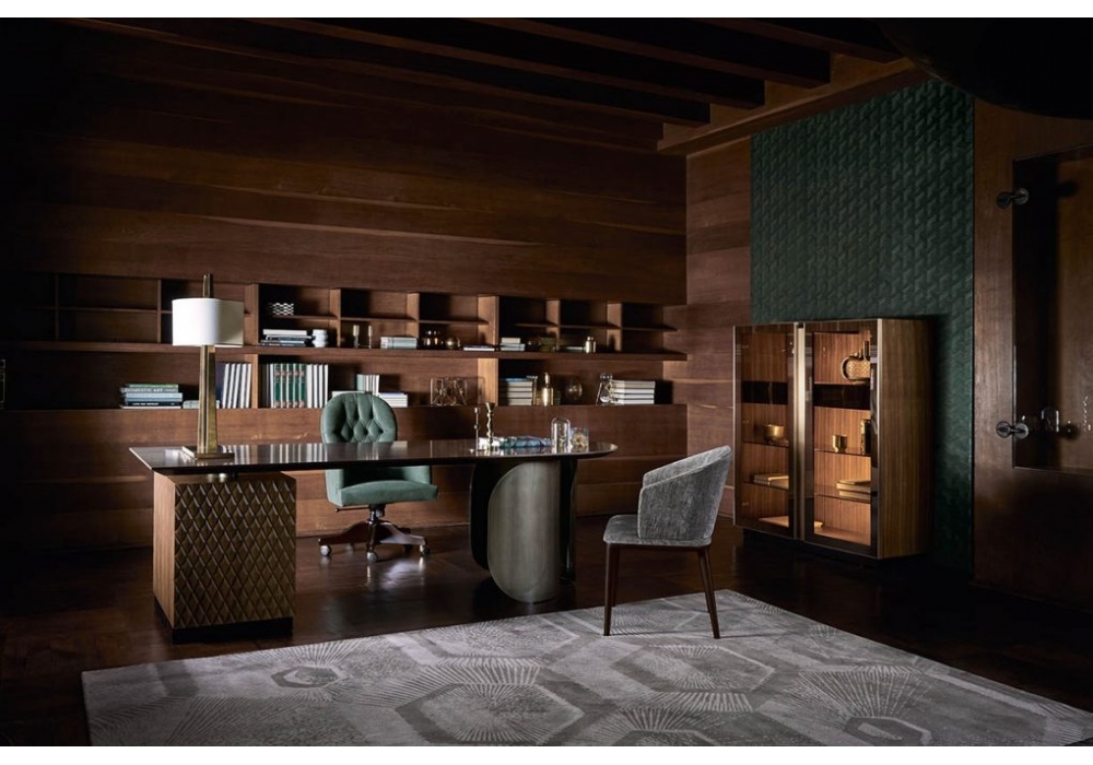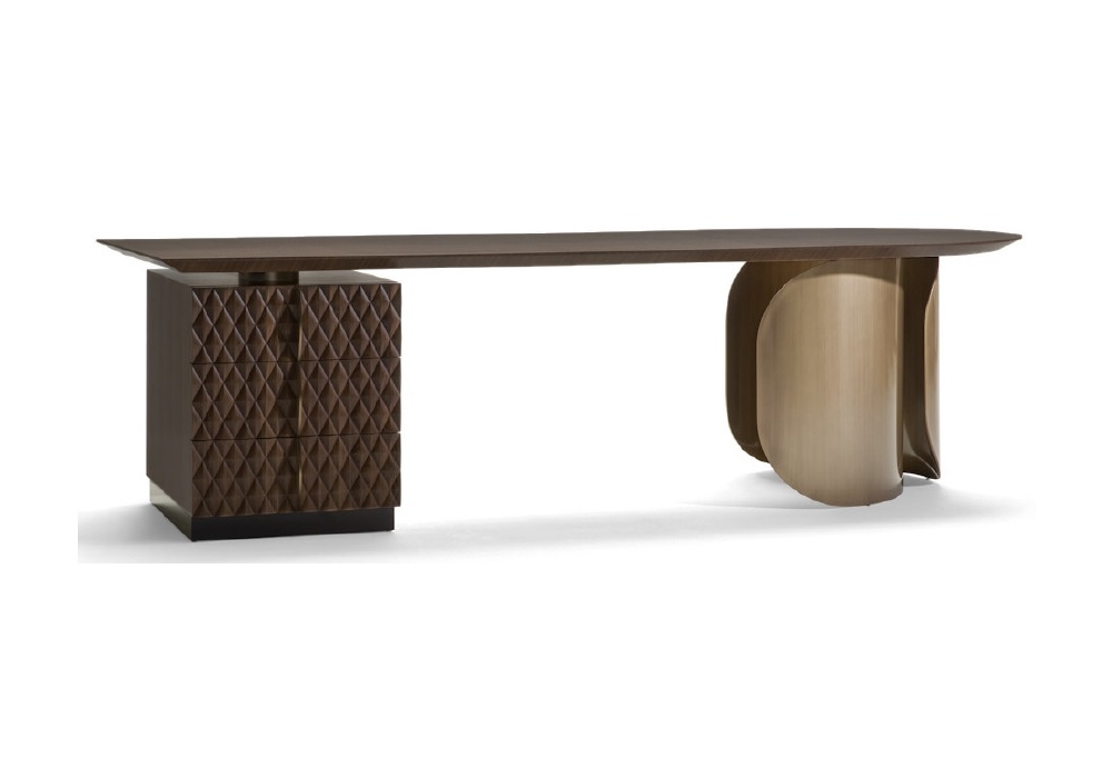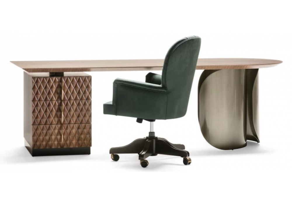 Erik von Castello Lagravinese Studio für Opera Contemporary, ist ein Schreibtisch aus Holz, der von einer eingebauten Kommode und einem hohlzylindrischen Metallsockel getragen wird.