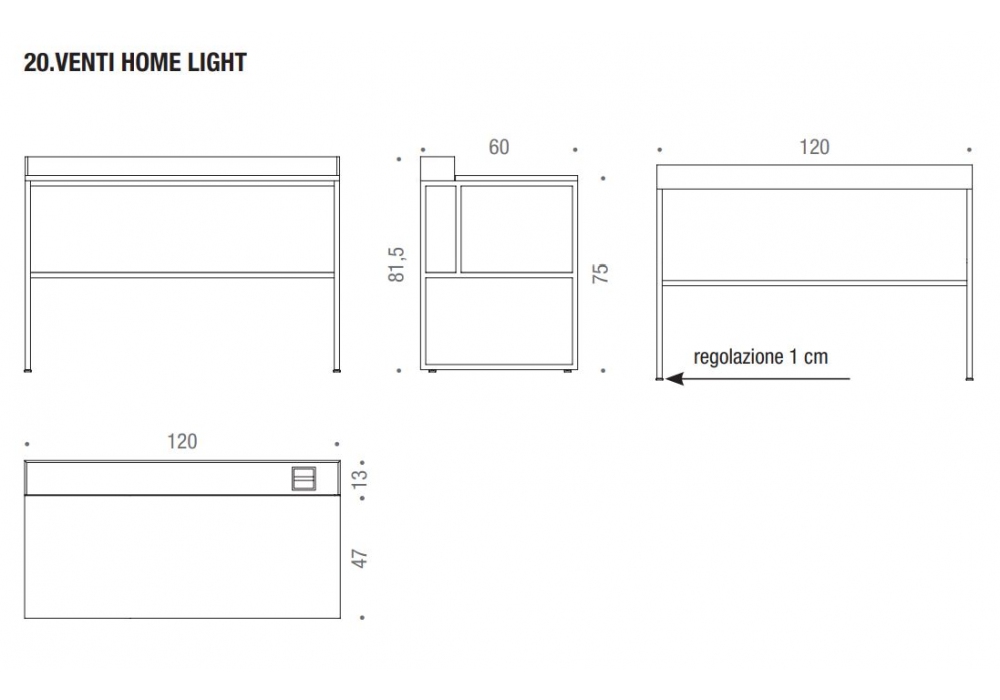 20.Venti Home Light, entworfen von 967ARCH für MDF Italia, ist ein Schreibtisch mit einer Struktur aus pulverbeschichtetem Stahl in verschiedenen Ausführungen und einer Platte aus gebleichter, heller oder anthrazitfarbener Eiche.