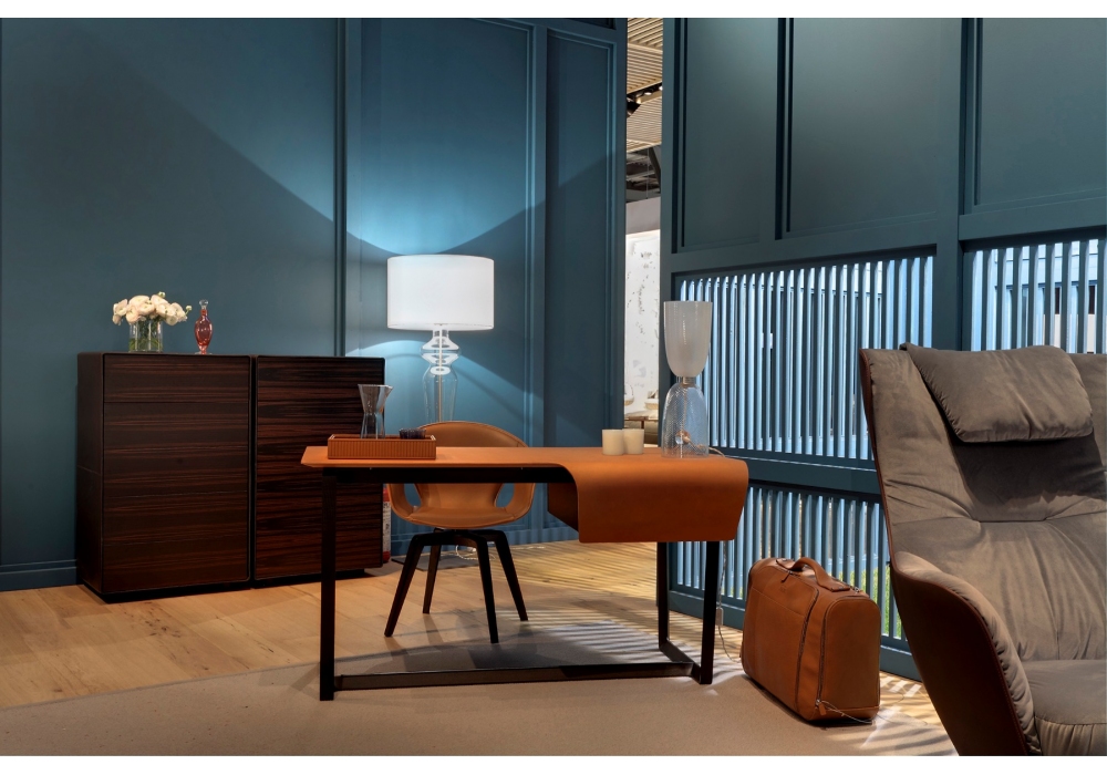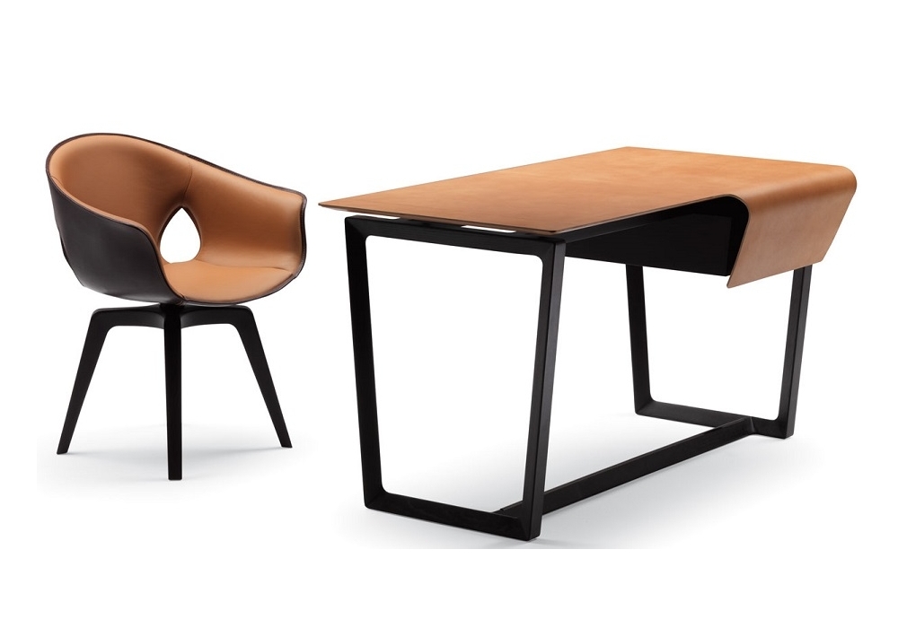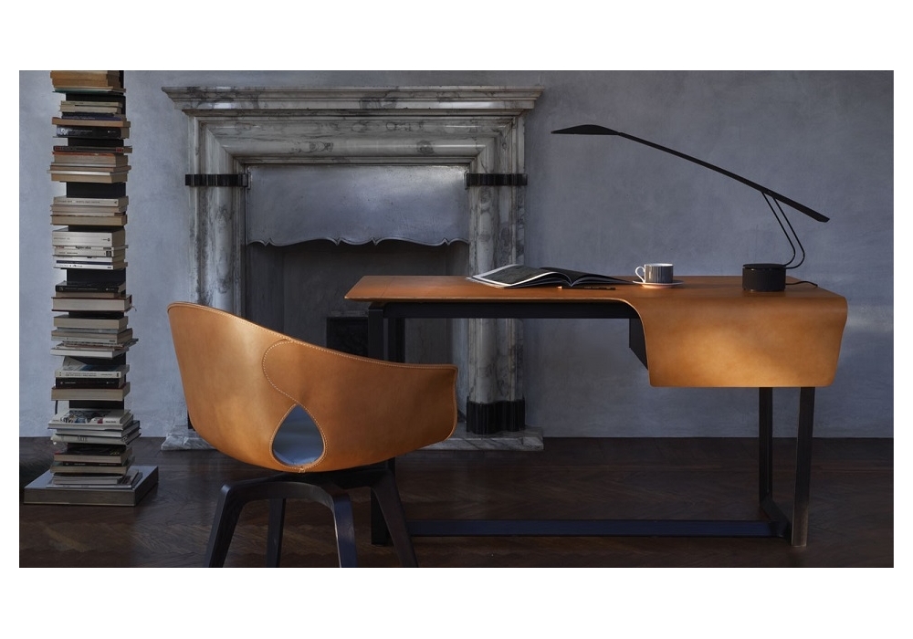 Fred Poltrona Frau: Ideale Begleiterin von Fred ist die Sitzgelegenheit Ginger, die entworfen wurde, um den Bürobereich der Wohnung noch vollständiger und harmonischer zu gestalten. Der heimische Schreibtisch für einen ganz eigenen behaglichen und eleganten Bereich. Der Bezug der Fläche aus kratzfest lackiertem MDF in der Farbe Schwarz wurde aus Saddle-Leder Extra. Die spezielle Fertigung lässt tatsächlich die Verarbeitung von Leder aus einem einzigen Stück ohne Naht zu. Zur Stärkung der Homogenitätswahrnehmung wurde die klare Schnittkante mit Schutzwachs und –farbe fertigverarbeitet. Ein besonderes handwerkliches Verfahren ermöglicht den Erhalt einer frontalen Wölbung des Leders, ohne dass interne Träger nötig sind. Auf der Oberfläche schaffen zarte Gravuren und handgefertigte Kalt-Druckpressungen delikate graphische Verzierungen. Die Struktur Fred besteht aus Esche-Massivholz in der FarbeWengé mit dreieckigem Querschnittsprofil,. Gleiches Material auch für das Schubfach als Ergänzung zum Schreibtisch und auf Metallschienen mit Selbstschließmechanismus. Für ein vereinfachtes Öffnen ist die Frontalkante auf 45° abgerundet. Der Bezug aus Saddle-Leder Extra ist in den Versionen Dunkelbraun und Kamel erhältlich. Zubehör aus galvanisiertem Metall, mattgrau und mit Schutzlack.