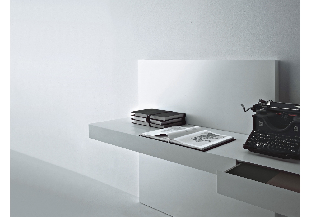 Modern von Piero Lissoni für Porro entworfen, ist ein Schreibtisch bestehend aus einer Schreibtischoberfläche mit Schublade, die an einer wandmontierten Platte aufgehängt ist.