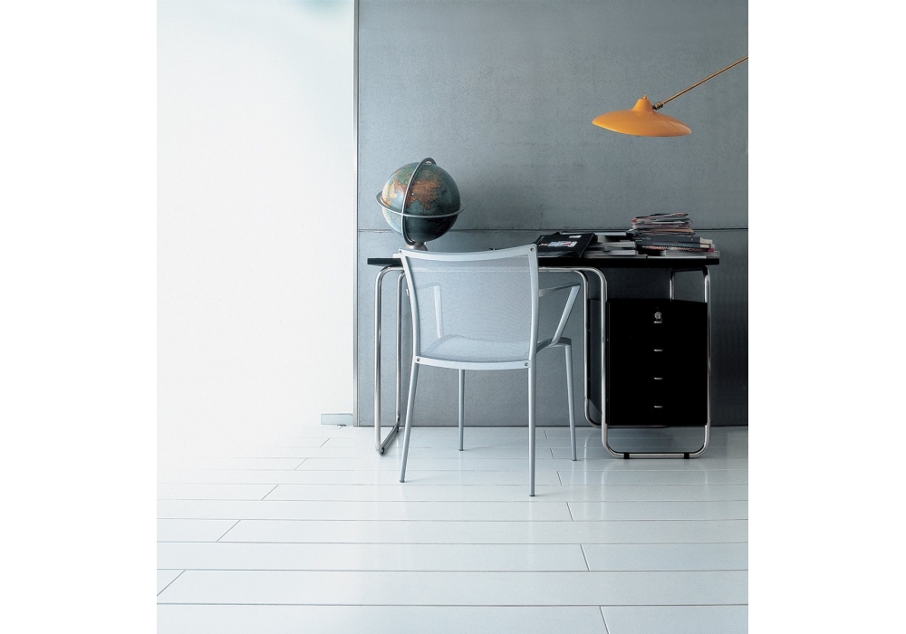 2725 Comacina von Piero Bottoni für Zanotta entworfen, ist ein Schreibtisch mit Struktur aus 18/8 Edelstahlrohr. Platte und Kommode kratzfest lackiert mit Prägung in Weiß oder Schwarz. Die Oberseite kann mit einer Einlage aus pigmentiertem Leder 90 sein. Die Kommode kann rechts oder links vom Sitz positioniert werden.