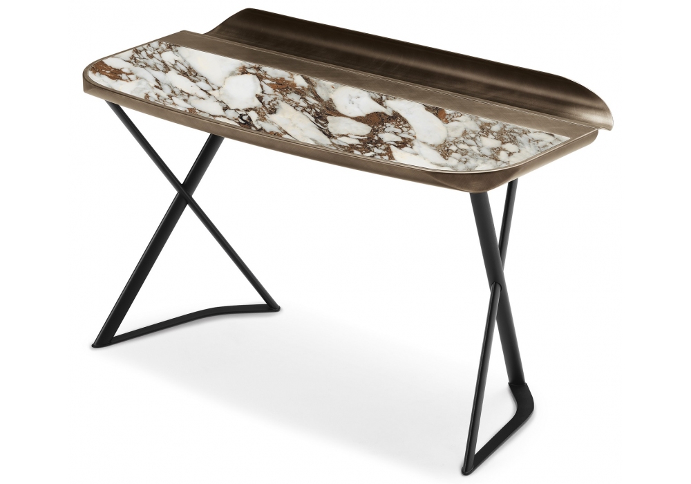 Cocoon Keramik von Paolo Cattelan für Cattelan Italia entworfen, ist ein Schreibtisch mit lackiertem Stahlgestell. Top aus Keramik Marmi in mehreren Farben mit Brushed Bronze oder Brushed Grey lackiertem abgerundetem Profil mit gerilltem Objekthalter aus Metall lackiert Brushed Bronze oder Brushed Grey.