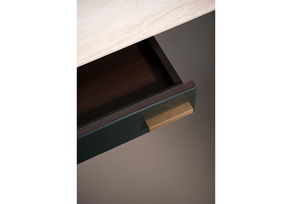 Ellipse Light Up von Federico Peri für Baxter entworfen, ist ein Schreibtisch aus MDF-Struktur mit Lederbezug. Steinplatte mit wasserabweisendem Schutzöl abgeschrägt. Bein mit LED-Streifen und Griffen aus satiniertem oder brüniertem vermessingtem Metall. Verfügbar in mehreren Ausführungen.