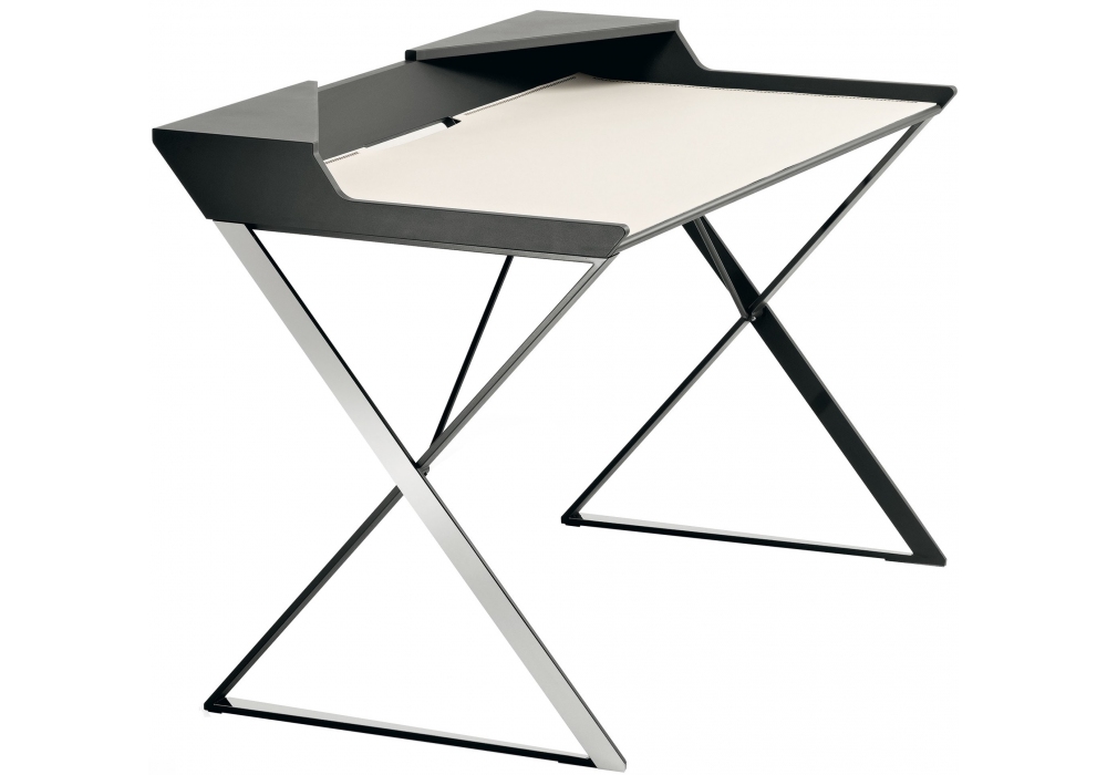 Qwerty von Andrea Lucatello für Cattelan Italia entworfen, ist ein Schreibtisch mit lackierter MDF-Platte, Gestell aus lackiertem Stahl und polierten EdelstahlProfil. Auf Anfrage mit PAD in Kernleder erhältlich.