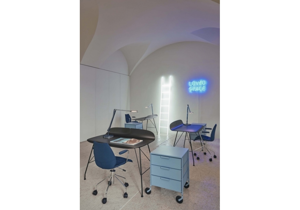 Earl Of Wood von Philippe Starck für Kartell entworfen, ist ein Schreibtisch mit Platte aus gebogenem Holz und Struktur aus verchromtem oder lackiertem Stahl. Verfügbar in mehreren Ausführungen.