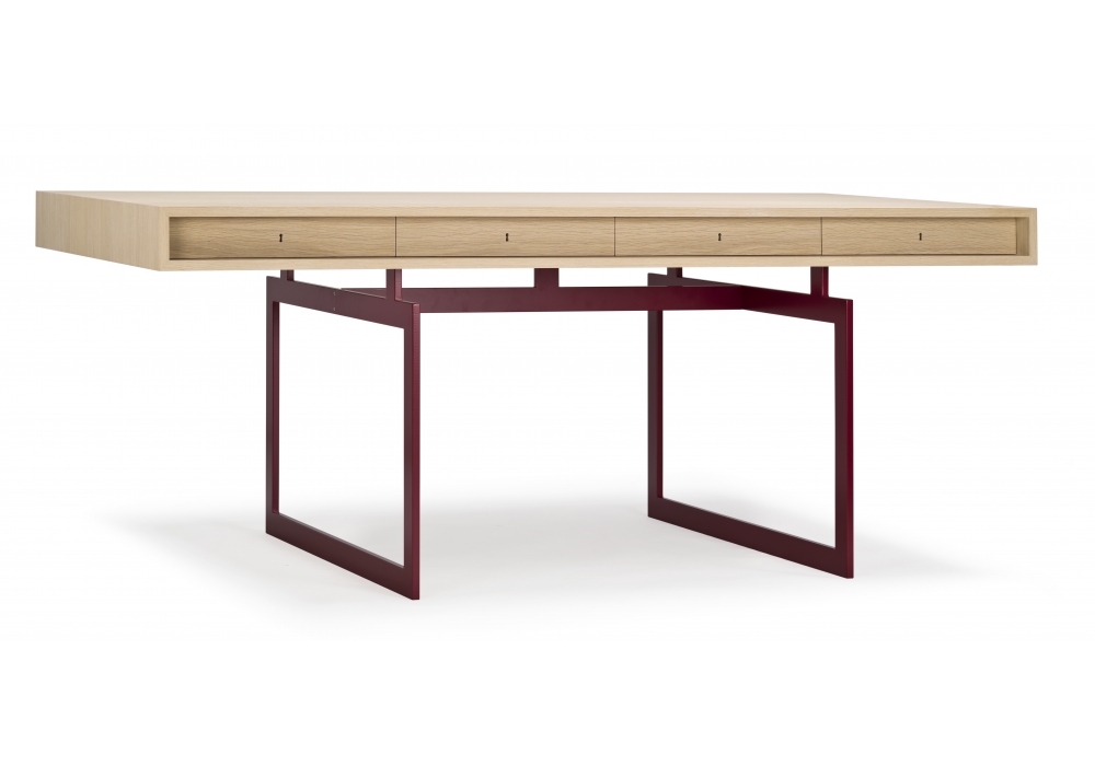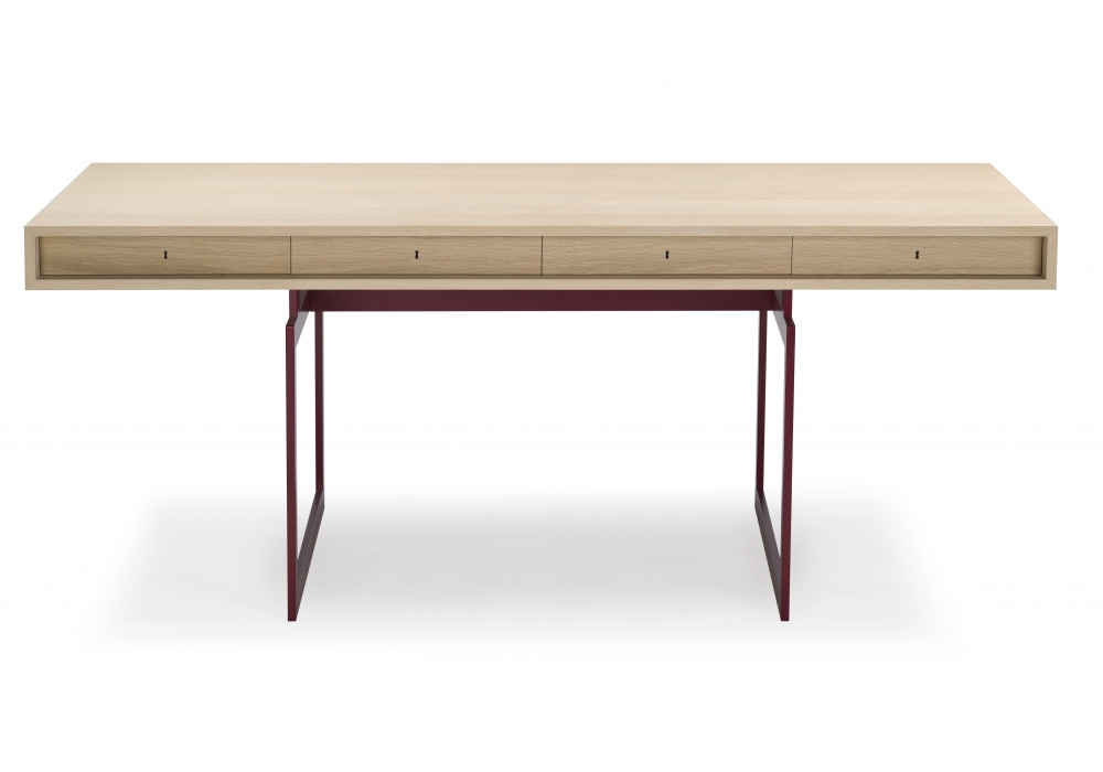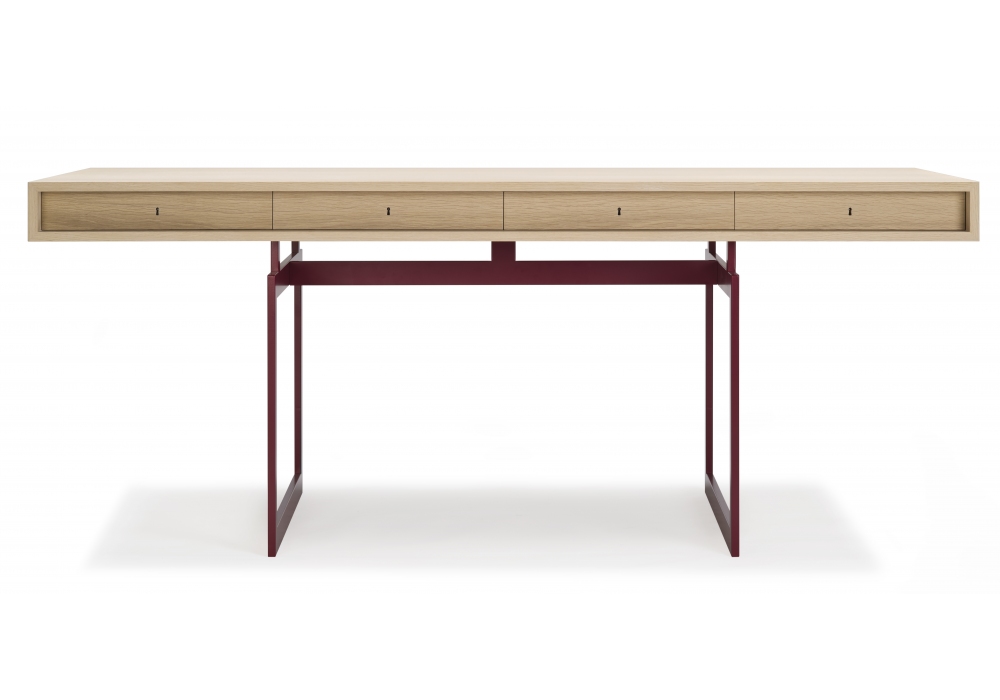 Office Desk von Bodil Kjær für Karakter entworfen, ist ein Schreibtisch mit Struktur aus pulverbeschichtetem Stahl oder gebürstetem Edelstahl und Platte aus Eichen- oder Nussbaumfurnier mit Klarlack.