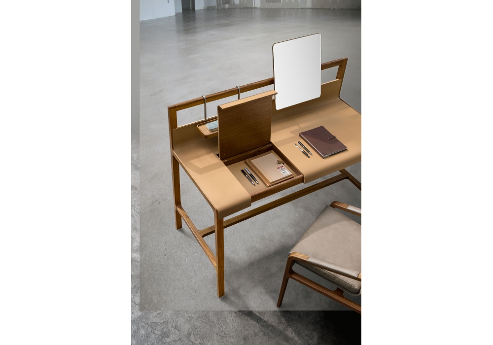Scribe von Giuseppe Bavuso für Alivar entworfen, ist ein Schreibtisch mit Struktur aus massiver lackierter Esche oder nationalem Nussbaum. In die mit Kernleder bezogene Platte integriertes Staufach. Auf Wunsch mit Spiegel und kleinem Regal ausgestattet. Haken aus bronzefarbenem, peltrox- oder champagnerfarben lackiertem Metall.