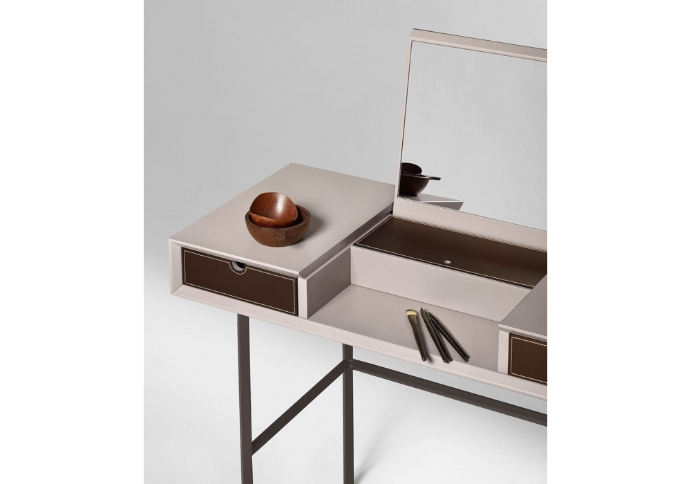Chapeau von Radice Orlandini für My Home Collection entworfen, ist ein Schreibtisch mit Gestell aus lackiertem Stahlrohr. Die Platte ist aus matt lackierter Holzfaser mit Ledereinsätzen angereichert, während sich an den Seiten zwei Schubladen und ein zentrales offenes Fach befinden. Der Schminktisch ist mit einem Klappspiegel mit Ablagefläche im unteren Teil, ebenfalls mit Leder bezogen, ausgestattet.