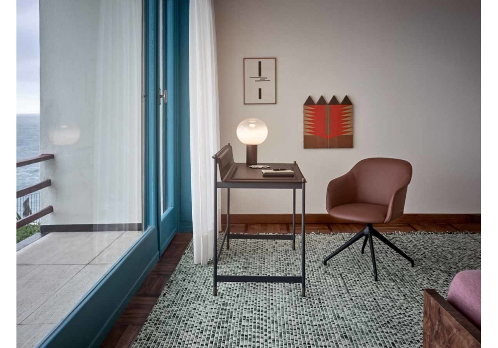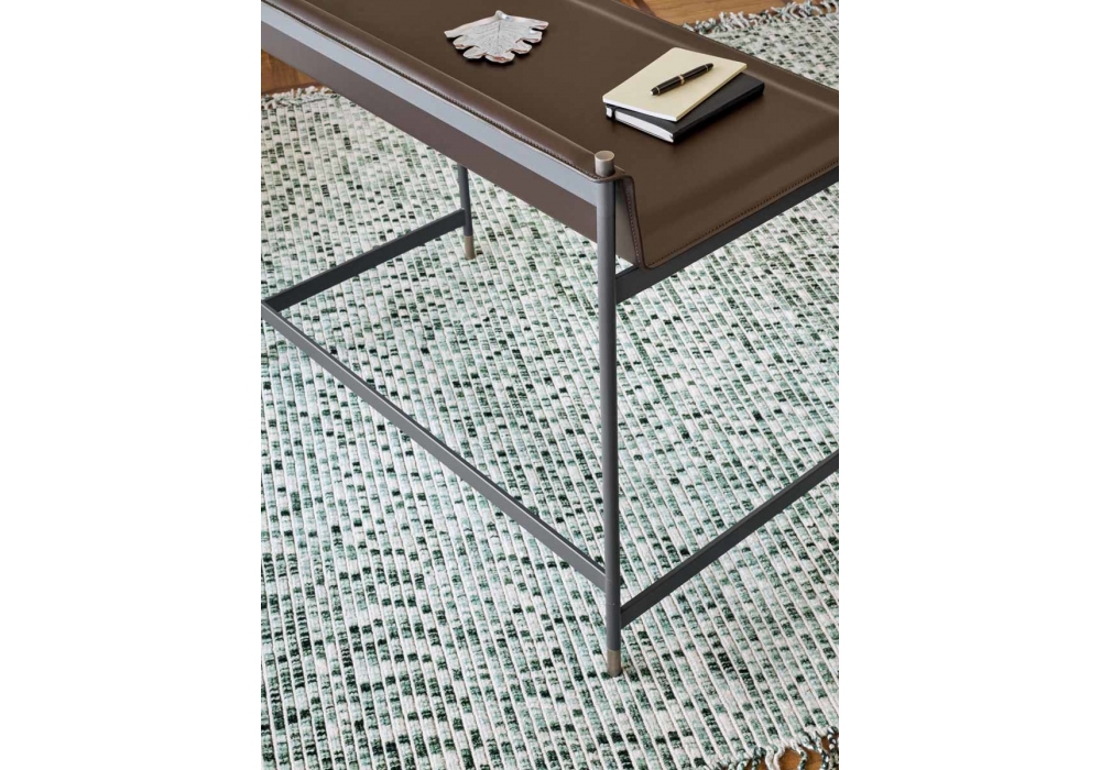 Terrazzo von Nicola Bonriposi für Potocco entworfen, ist ein Schreibtisch mit einer Struktur aus pulverbeschichtetem Stahlrohr in Anthrazit-Prägung mit Fußdetails und zylindrischen Befestigungsdetails auf der Oberseite aus brüniertem Messing. Oberseite mit weicher Polstereinlage aus Polyurethanschaum, mit Leder bezogen und mit sichtbaren Umfangsnähten versehen.