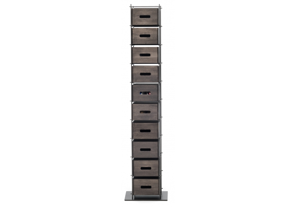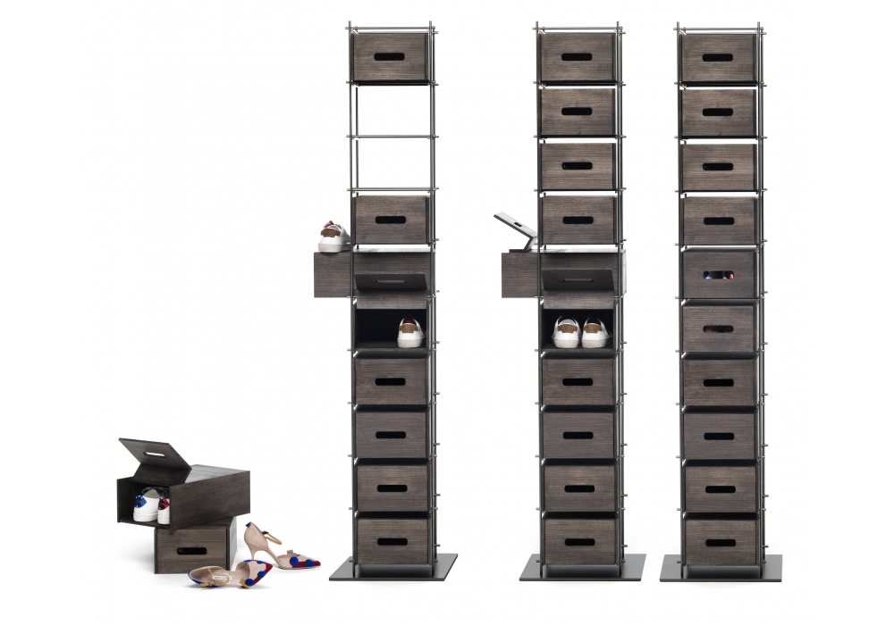 Manolo von Idelfonso Colombo für Mogg entworfen, ist ein Schuhregal mit Metallstruktur in brüniertem Ausführung und Behältern aus massiven Eschenholz in mokka gebeizt Ausführung.