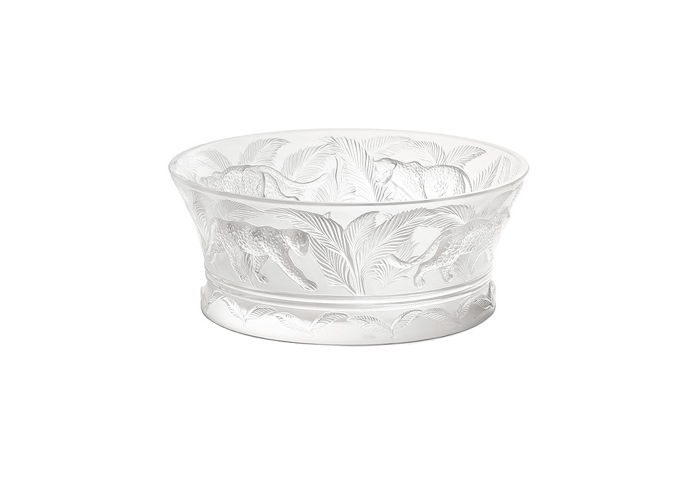 Jungle entworfen und hergestellt von Lalique, ist eine Schüssel aus transparentem Kristall.