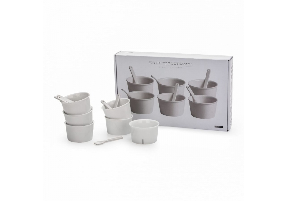 Estetico Quotidiano entworfen von Selab & Alessandro Zambelli ist ein Set aus sechs Eisbechern mit Löffeln, die vollständig aus weißem Porzellan bestehen