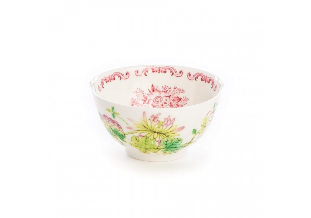 Hybrid Olinda entworfen von CTRLZAK für Seletti ist eine weiße Porzellanschale die durch die Kombination zweier gegensätzlicher Formen entsteht. Die Oberfläche ist mit verschiedenen Blumenfiguren und Pigmenten verziert.