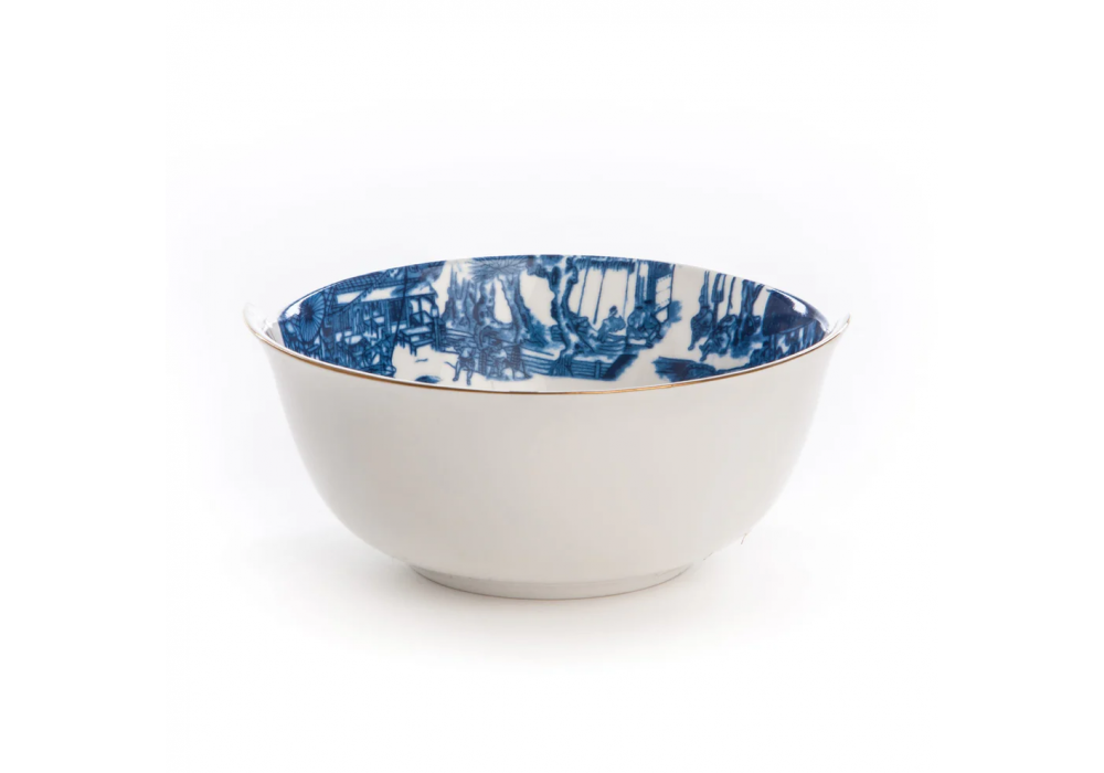 Hybrid Despina entworfen von CTRLZAK für Seletti ist eine weiße Porzellanschale die durch die Kombination zweier gegensätzlicher Formen entsteht. Der Innenraum ist mit verschiedenen Figuren und Pigmenten verziert.