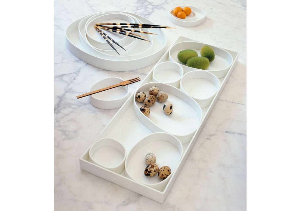 Vertigo Round, von Naoto Fukasawa für B&B Italia entworfen, ist ein runde Tablett mit Schalen aus weißem Acrylpolyesterharz.