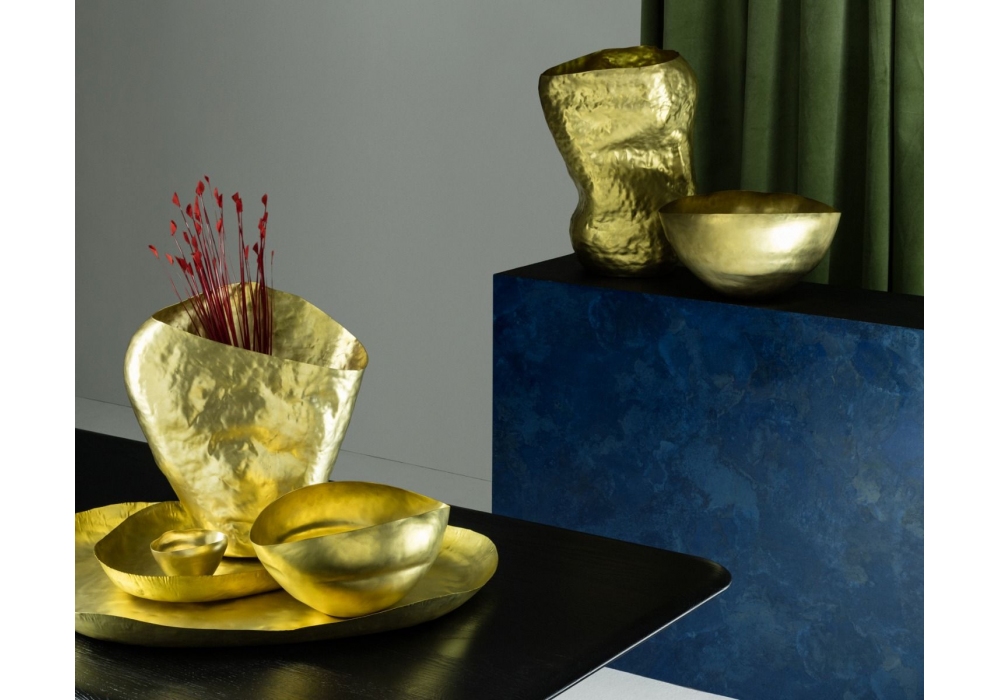 Bash von Tom Dixon entworfen, ist ein handgefertigtes Tablett aus einem einzigen Messingblech, das mit einer Goldwäsche versehen ist. Jedes Stück ist in seiner Form einzigartig.